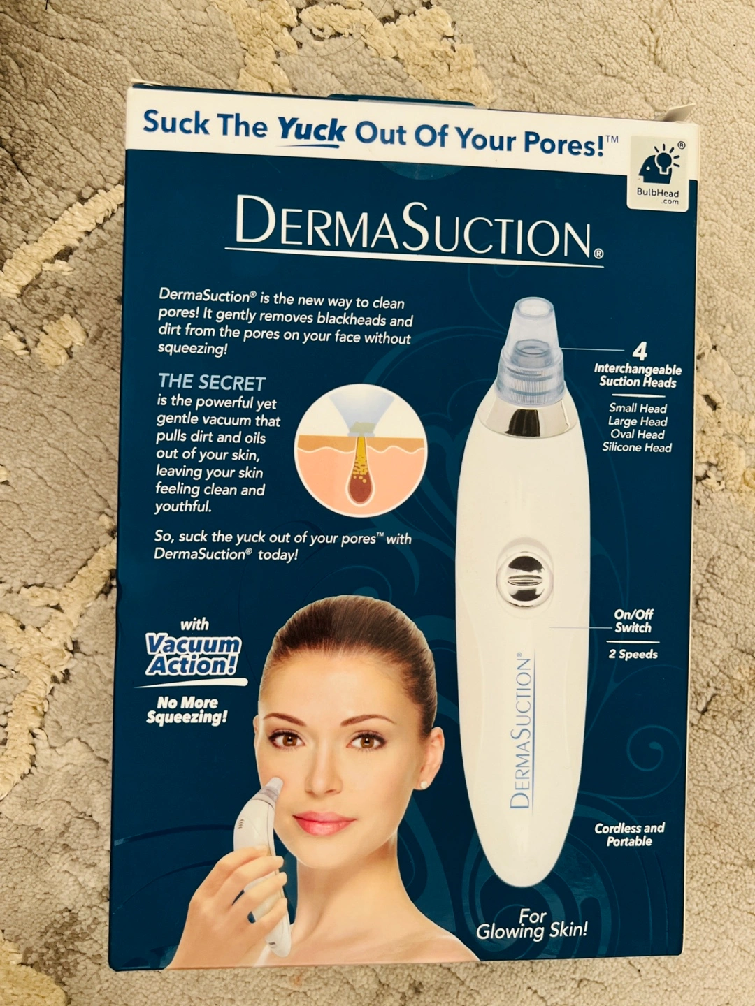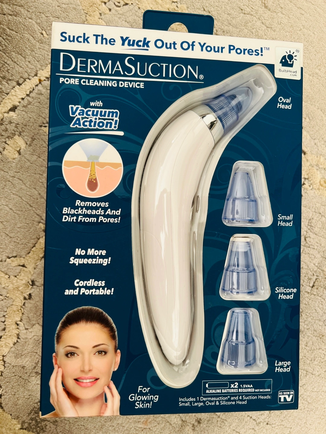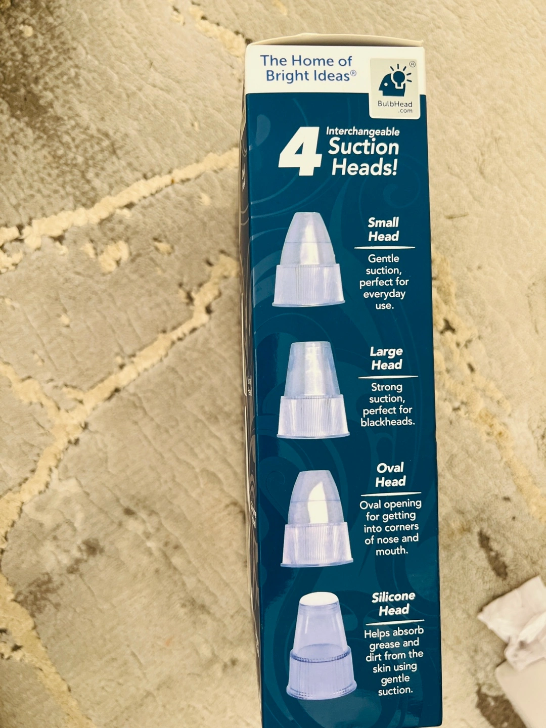 Cordless and portable pore cleaning device. Includes four interchangeable heads: Small, Large, Oval and Silicone.