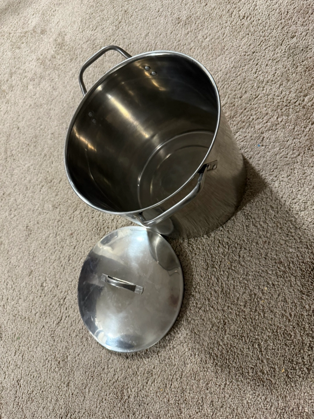 Large stainless steel pot with lid. Great for canning or large batches of soup.