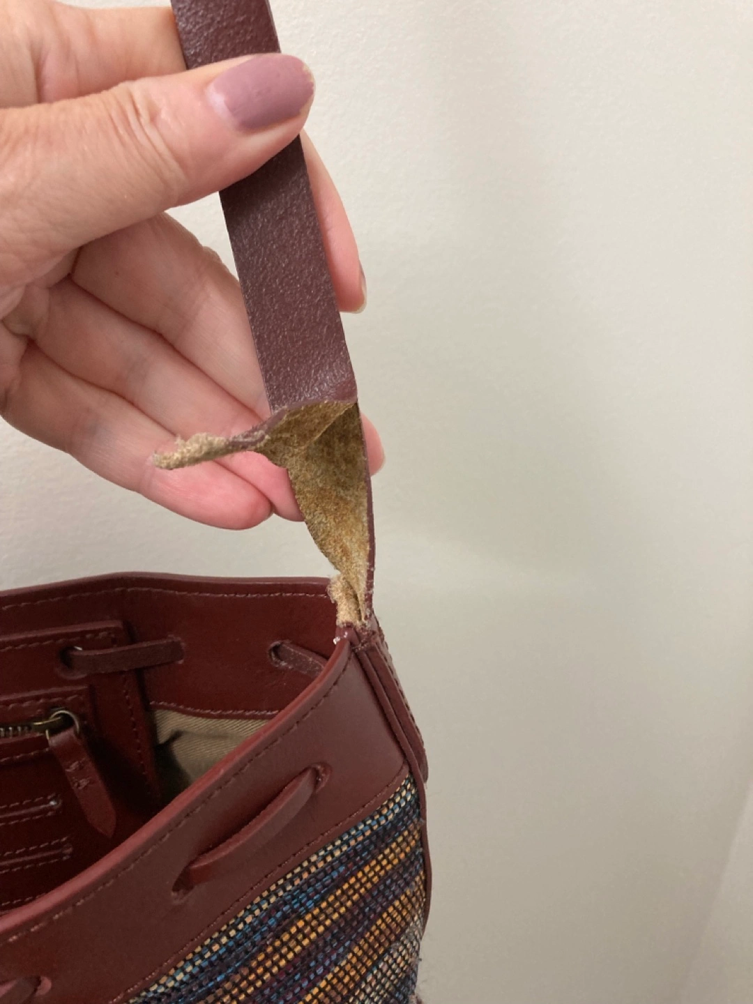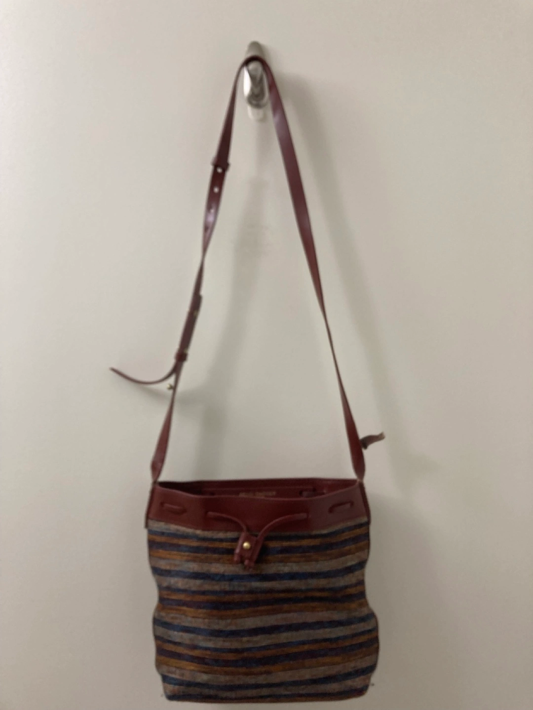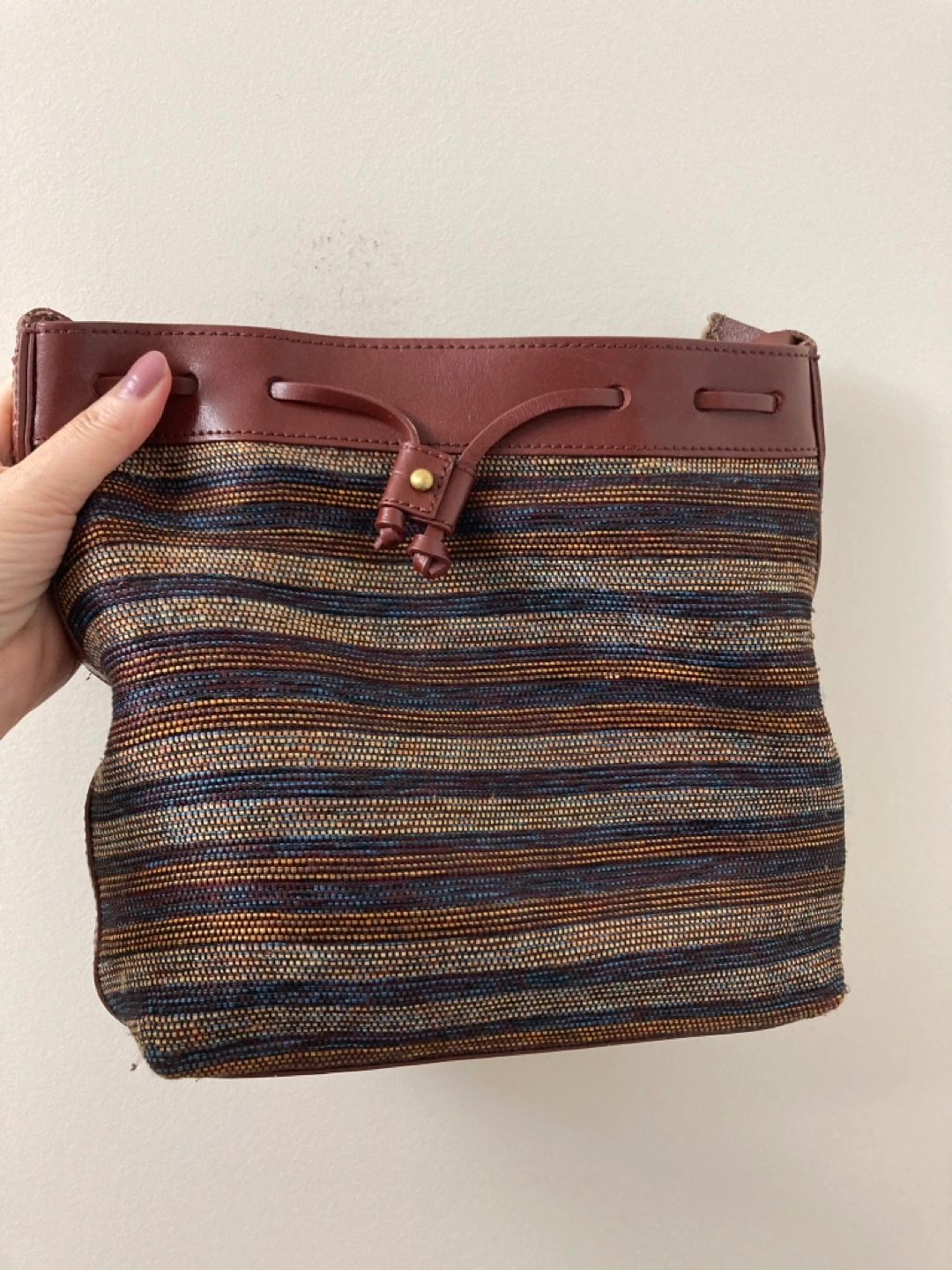 Brown leather bucket bag with a striped fabric body. Features a drawstring closure and an adjustable shoulder strap. Minor wear to the strap.