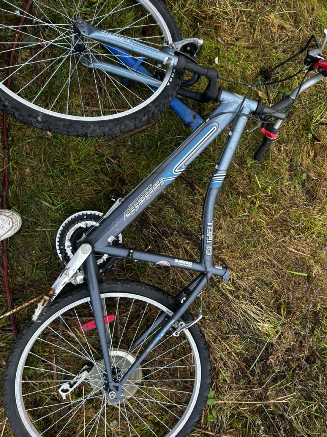 Mountain bike with front suspension, Shimano speed gears, and a grey and blue frame.