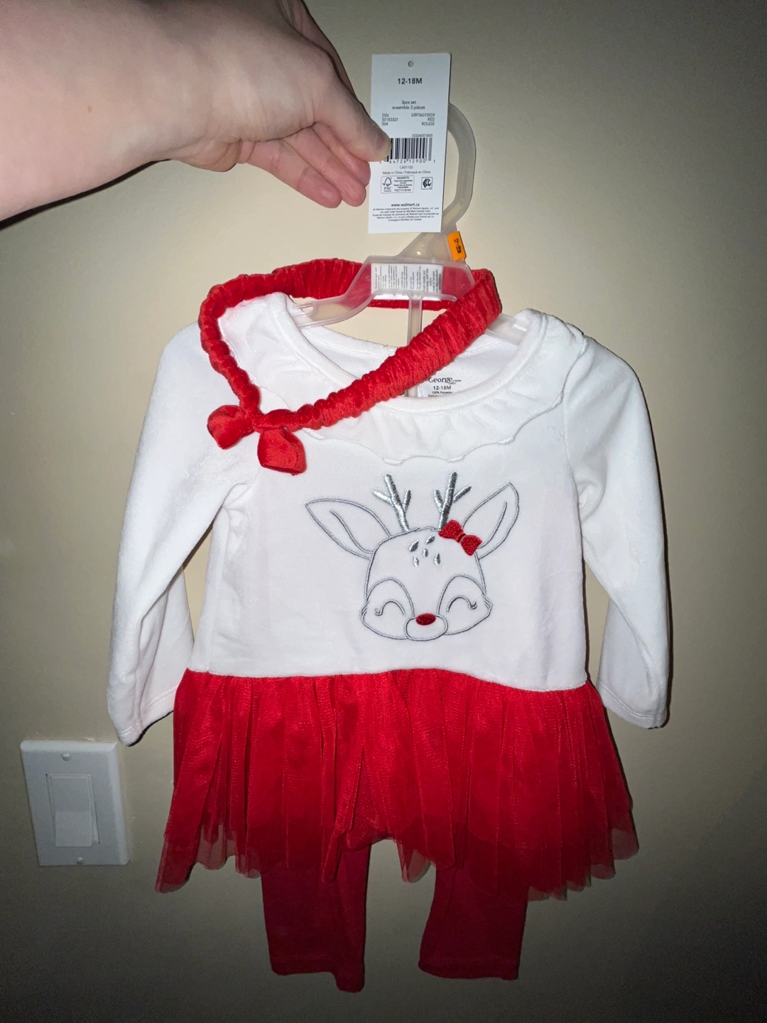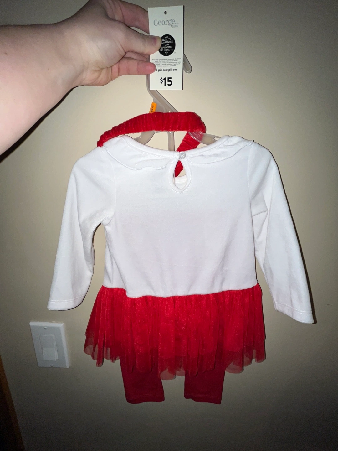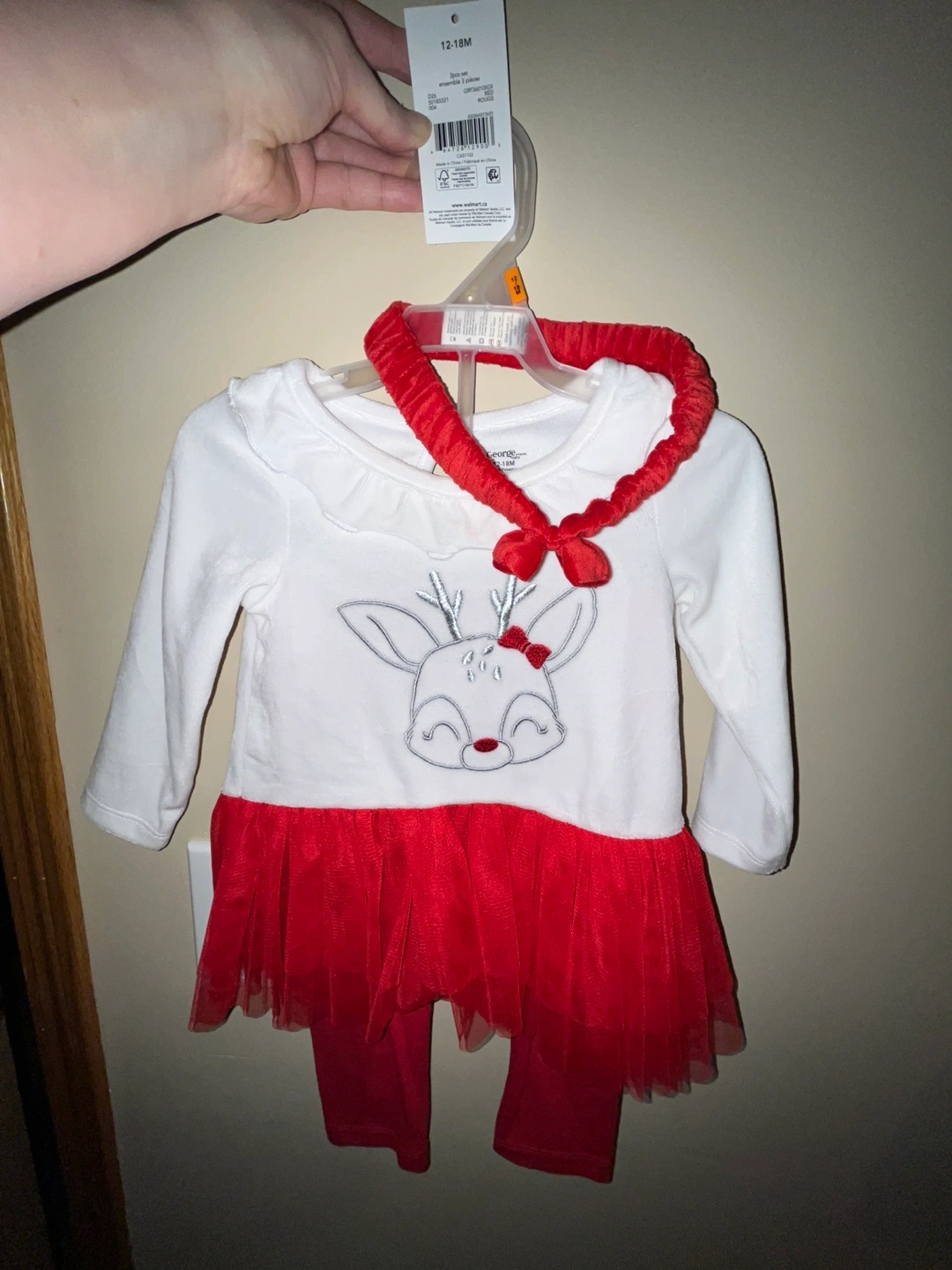 Christmas Baby Girl 3-piece Baby Outfit - 12-18M (Dress, Leggings and Headband) Didn’t end up using this outfit for our photo shoot for Santa as we chose a different one instead that we had. Outfit was only washed in preparation to wear Selling for $8 firm Pick up in RIVERGROVE AREA -You can look up on Google Maps if unsure From a sf/bf/dog friendly home