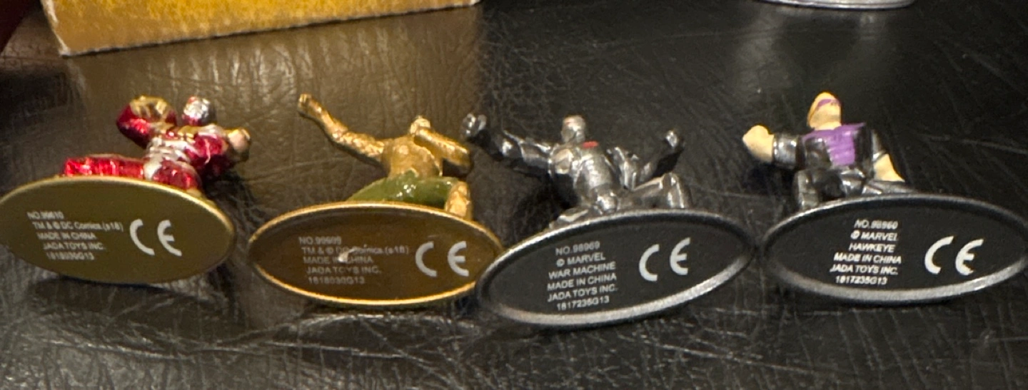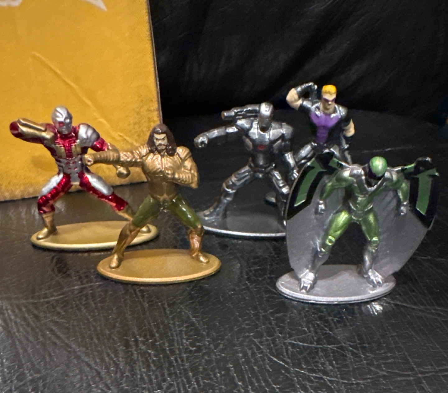 Set of five mini figures. Includes: War Machine, Hawkeye, Vulture, Aquaman, deadshot characters in metal Available by appt for pick up at 1421 Bloor Street West - inside Martin Espresso Cafe