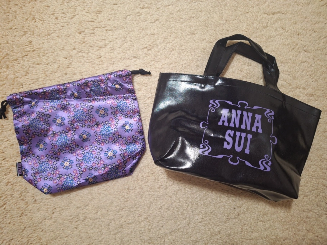 Small Black tote bag with purple Anna Sui logo, with a matching purple floralpattern drawstring pouch. ***BRAND NEW, NEVER USED*** Cash Only, Pick up at Fairview Mall T&T Supermarket.