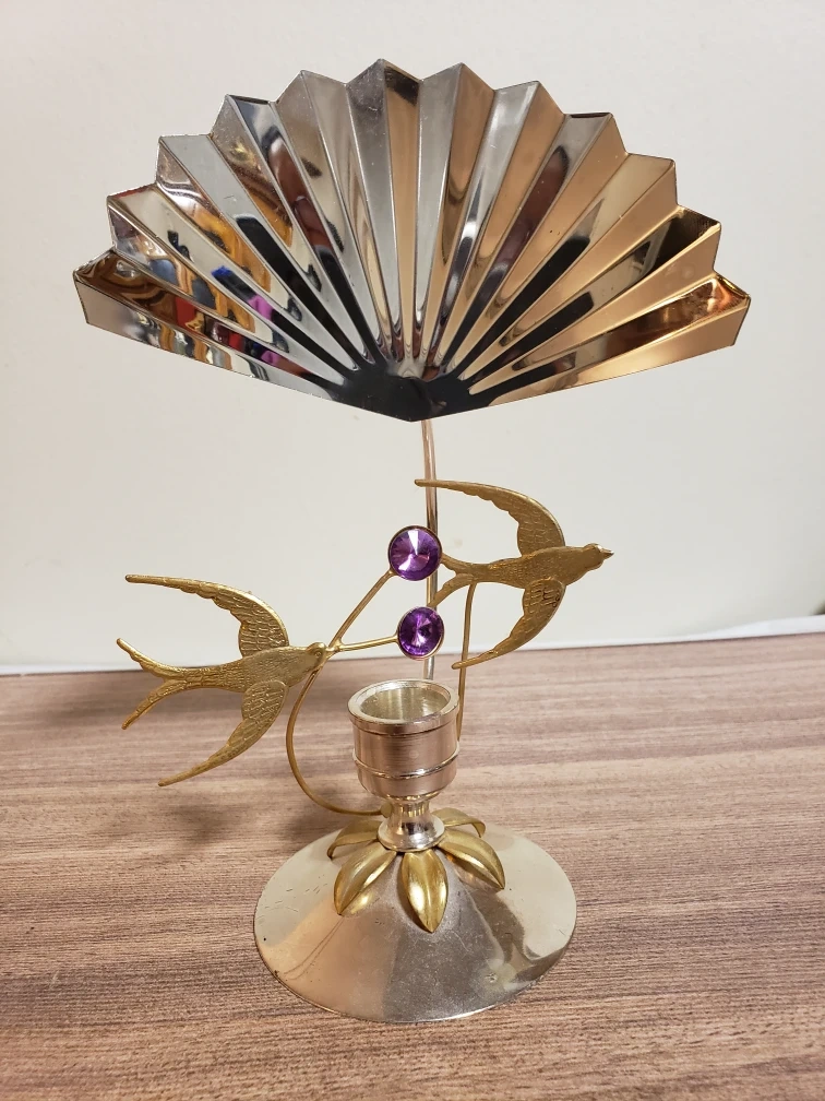 made in Italy. Silver plated candle holder with a fan design and two gold birds. Has two purple jewels.