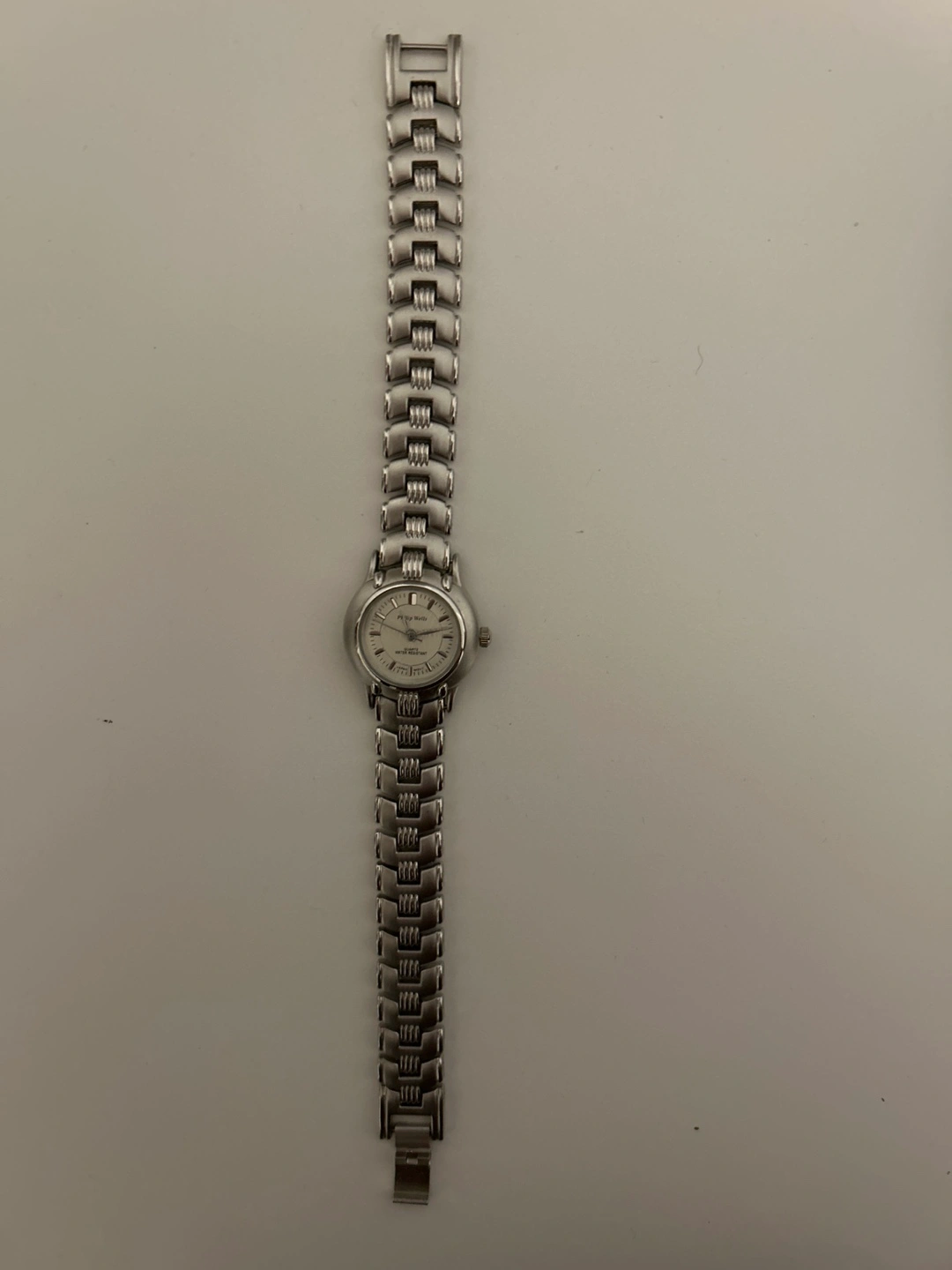 Silver tone wrist watch with a silver metal band. Quartz movement.*******Needs Battery