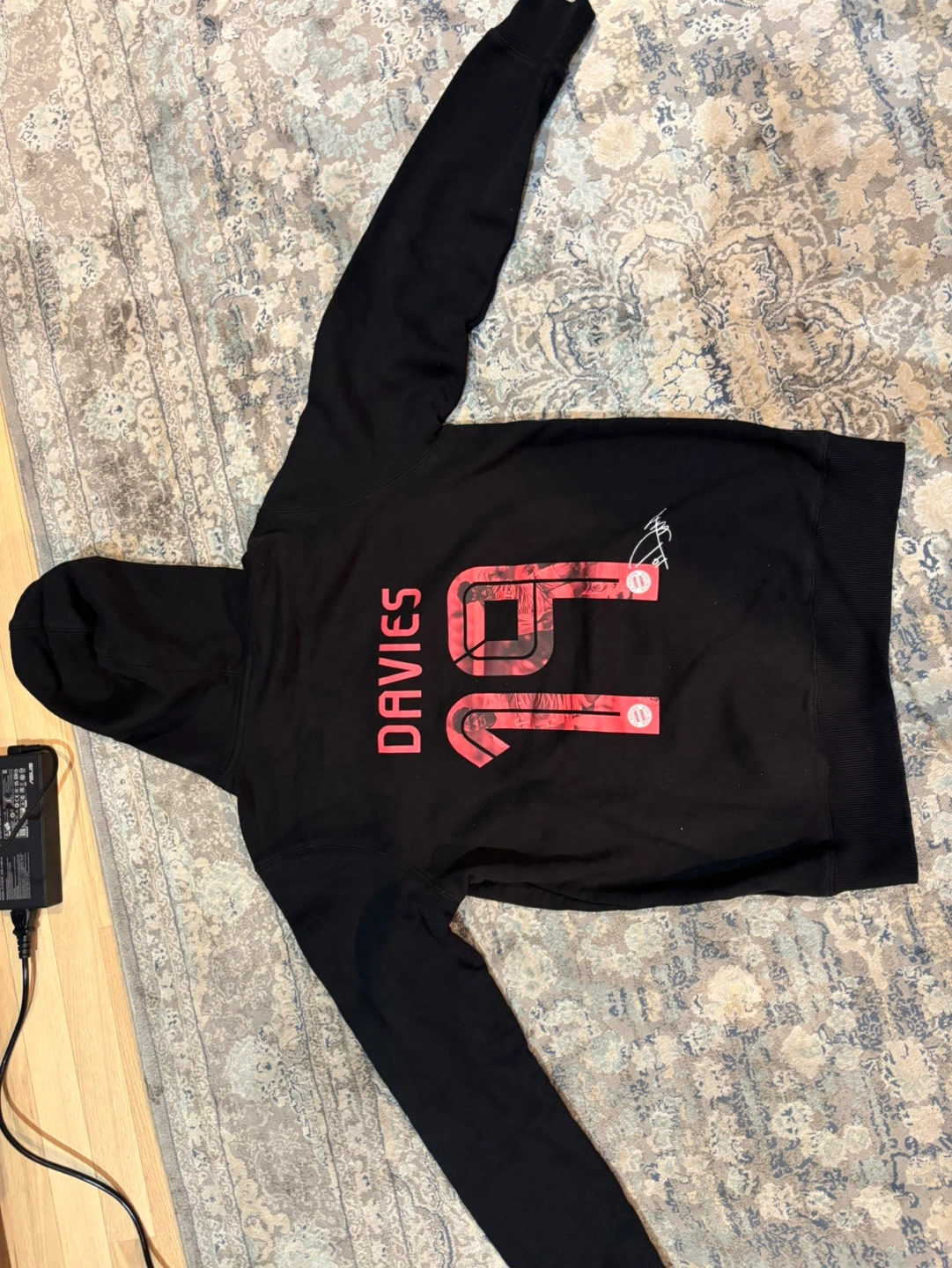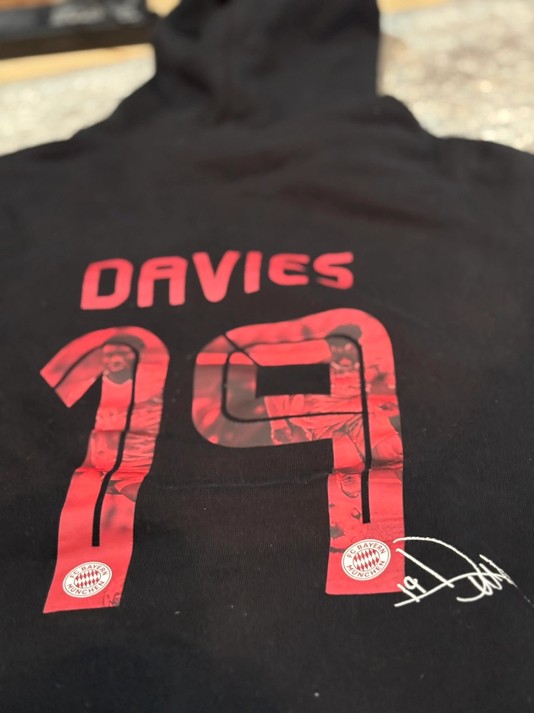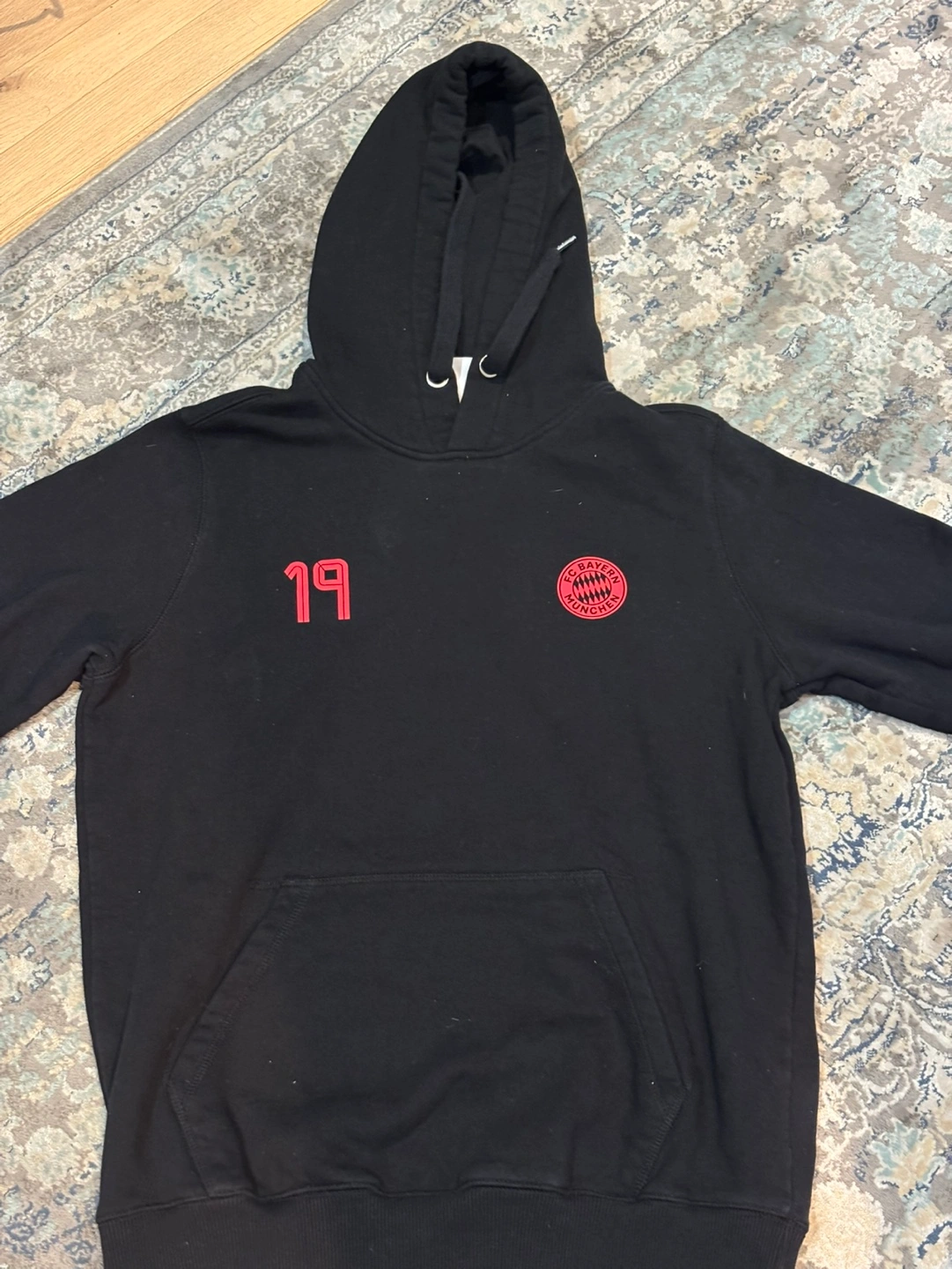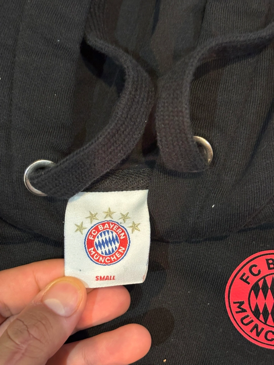 Black hoodie with red lettering and the FC Bayern Munich logo. Size small.