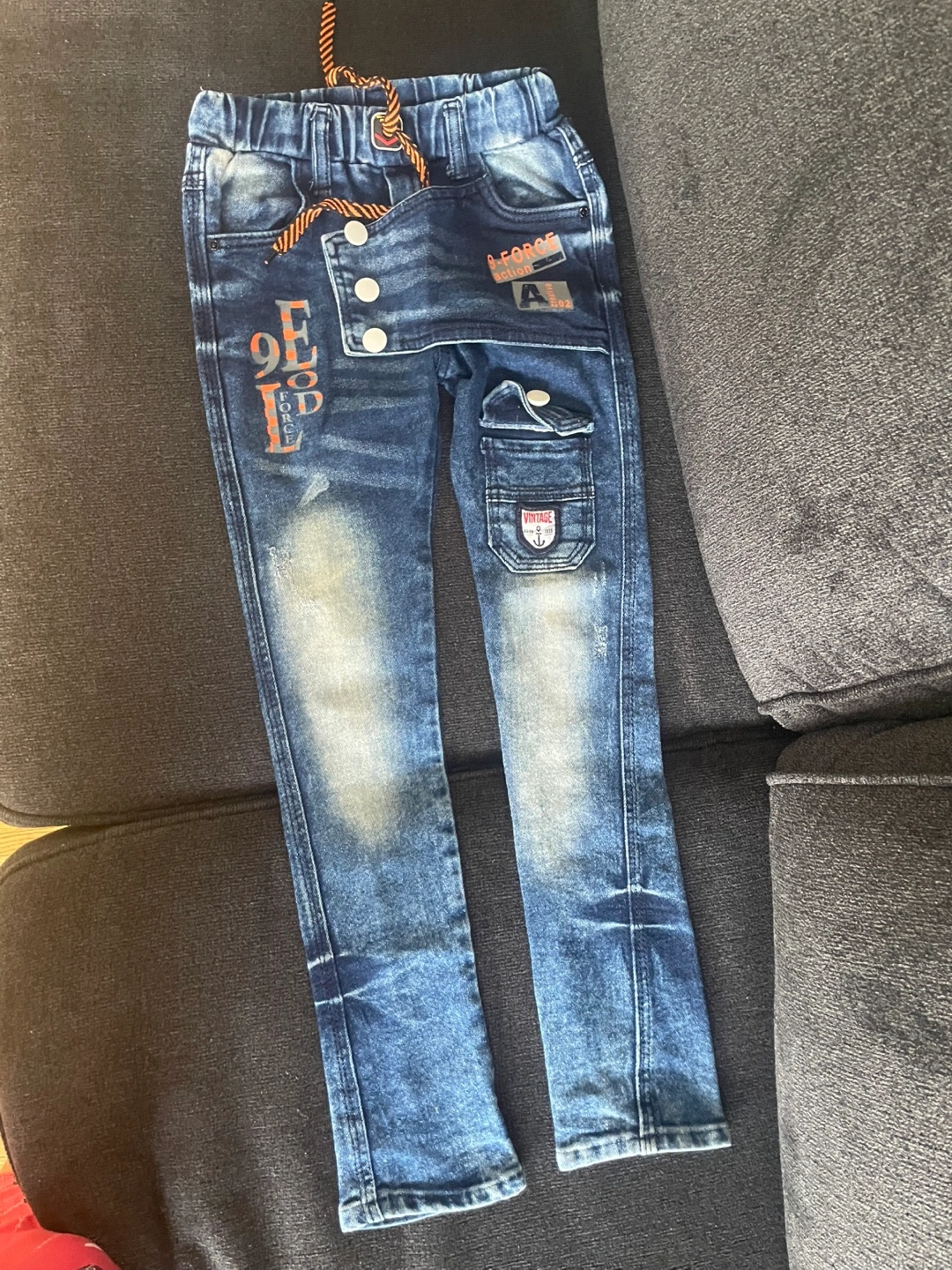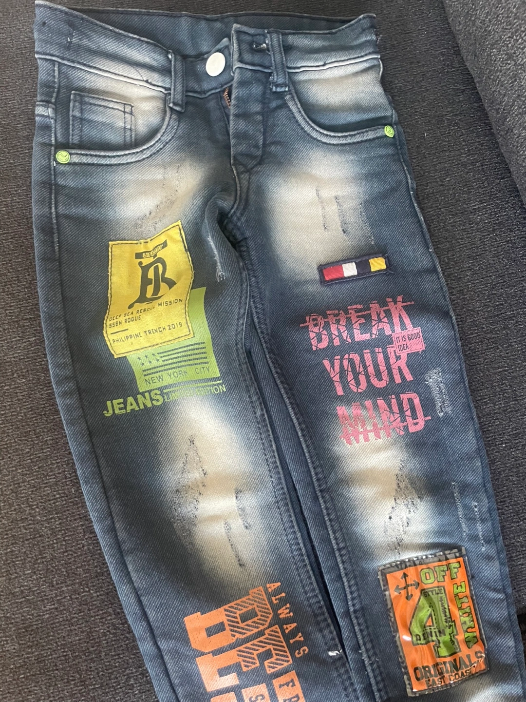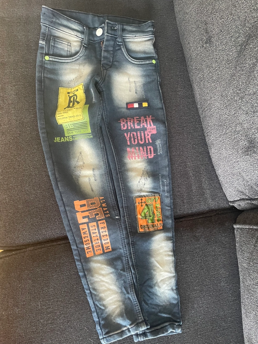 Blue designer jeans for kids. Features various patches and designs. Size are good for 6 to 8