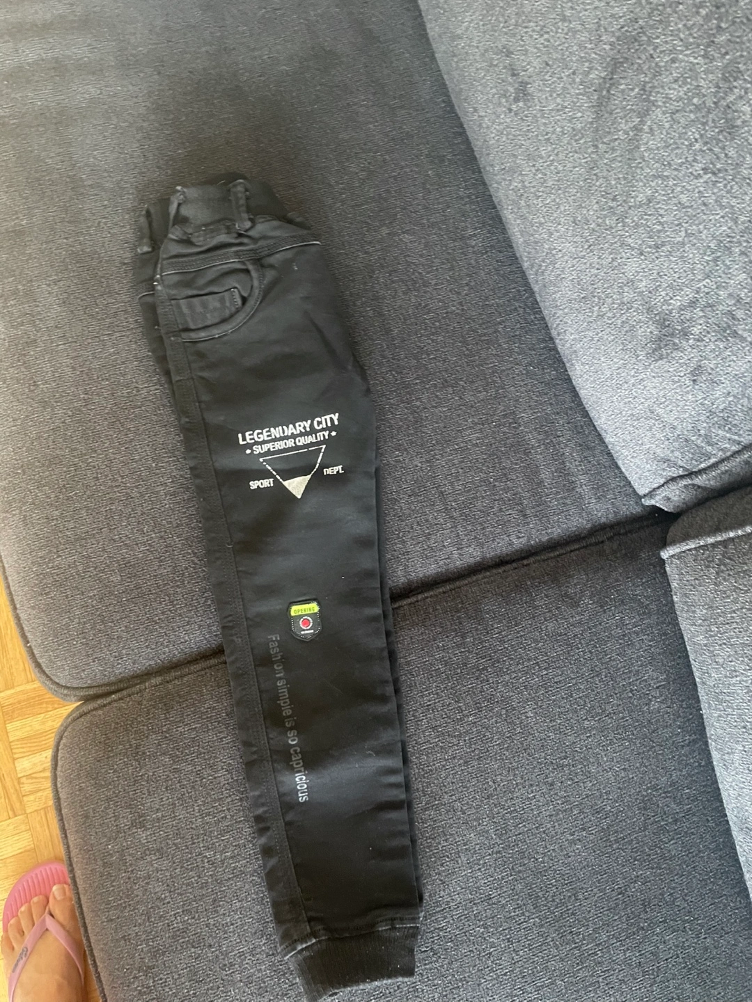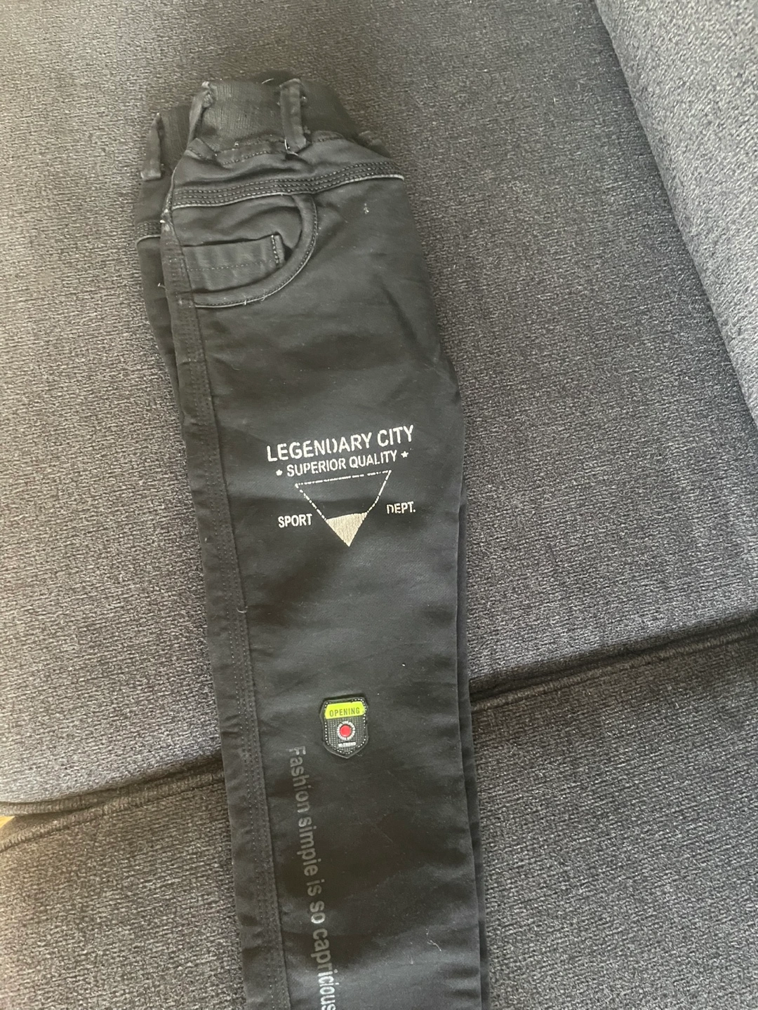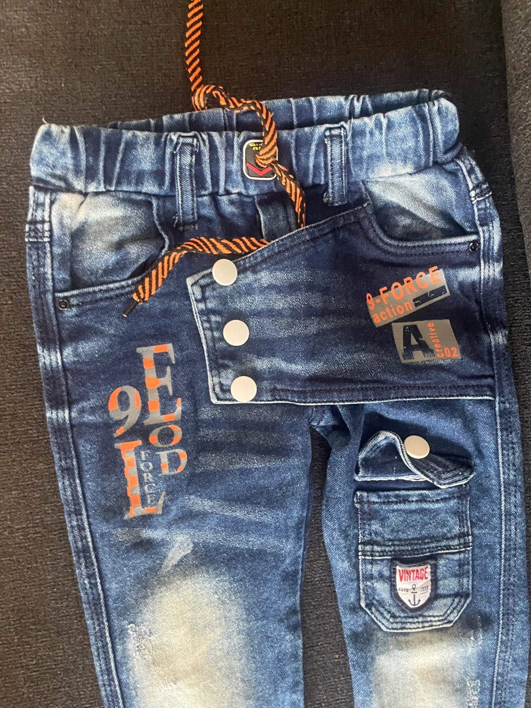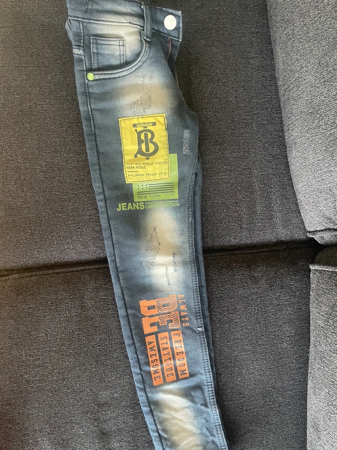 Blue designer jeans for kids. Features various patches and designs. Size are good for 6 to 8