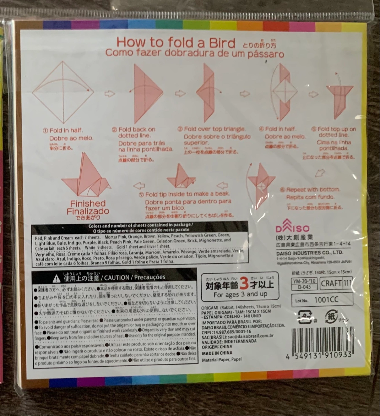100 sheets of origami paper. Suitable for ages 3 and up. Instructions included.
