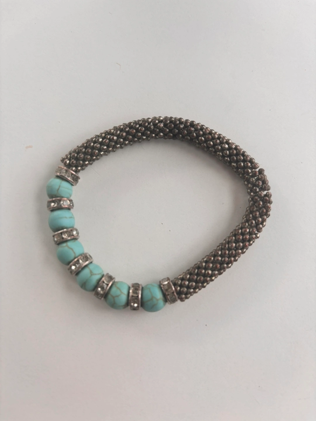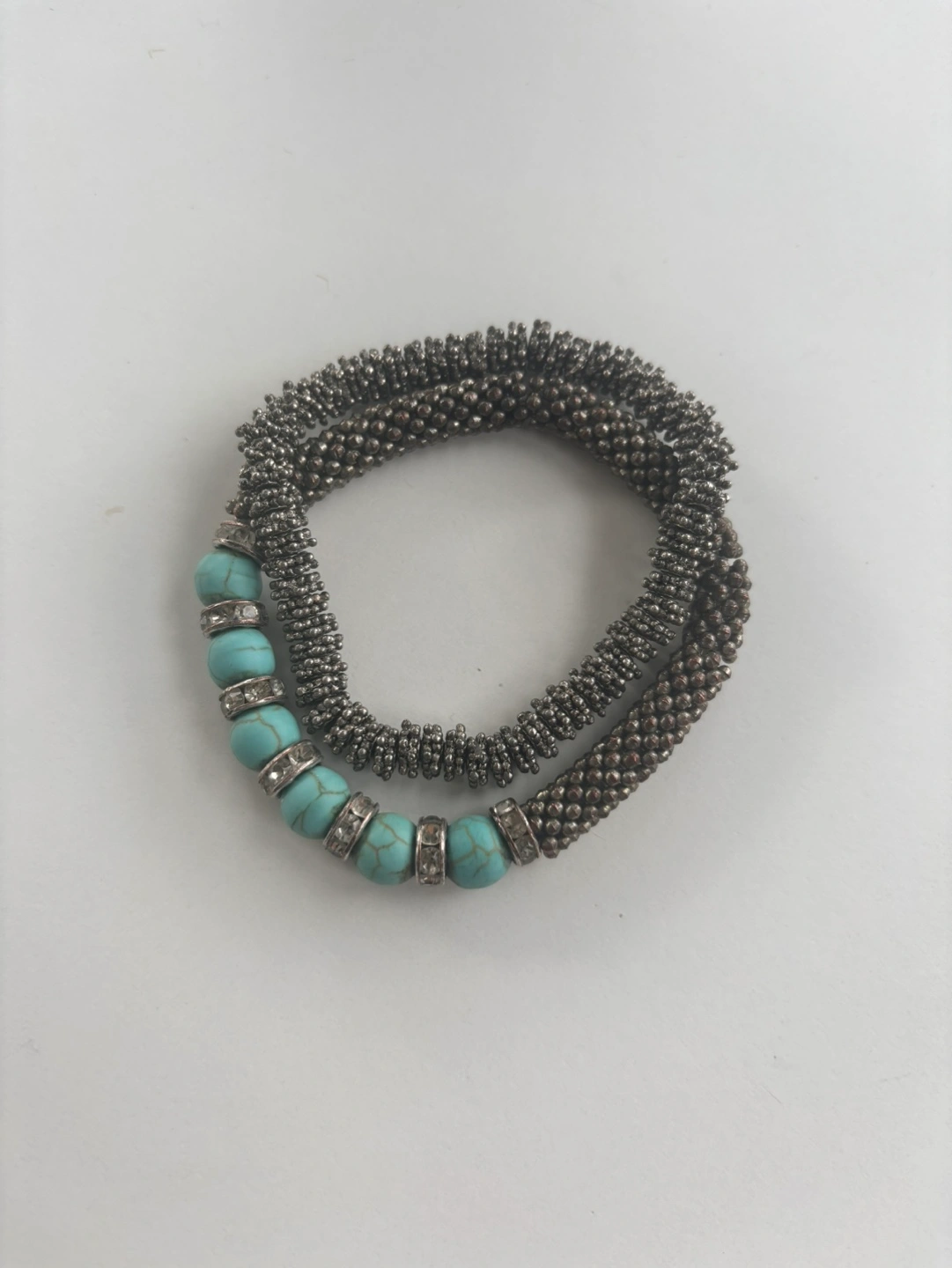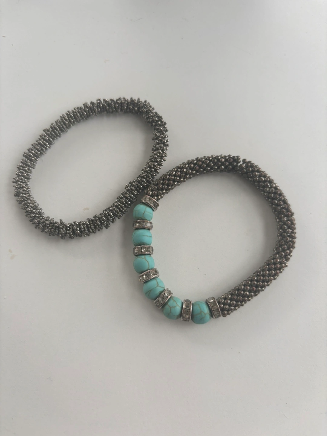Two bracelets. One with turquoise beads and silver accents. One is a simple silver chain. $15 each