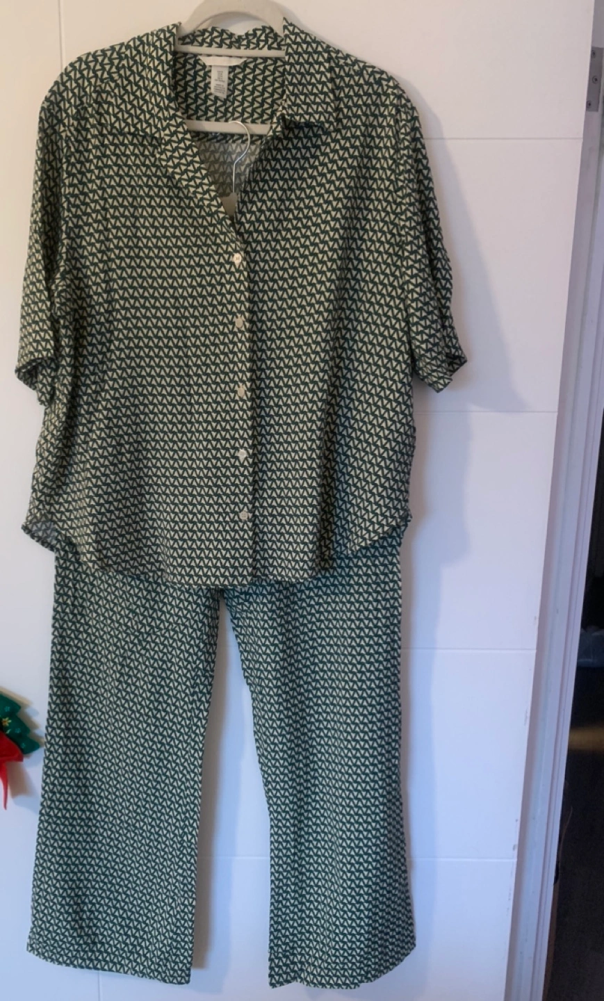 Top is a medium loose fit Pants are an 8 with two hip pockets and button/zipper fly Green/beige/cream pattern Please feel free to take a look at my other listings to make bundles for a better deal! Most items are $10 or less! All sales final Serious inquiries only please Pick up only - downtown near Richmond/George