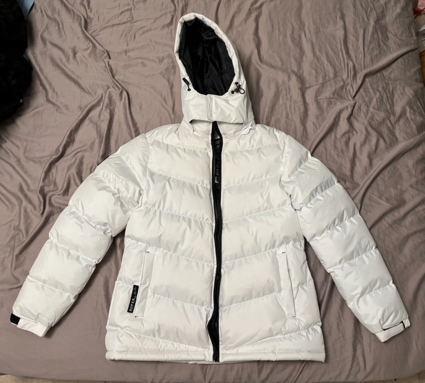 White winter jacket with black accents. Features a hood, zipper closure, and multiple pockets. Brand new never used Purchased at the price of $200+ For pick up