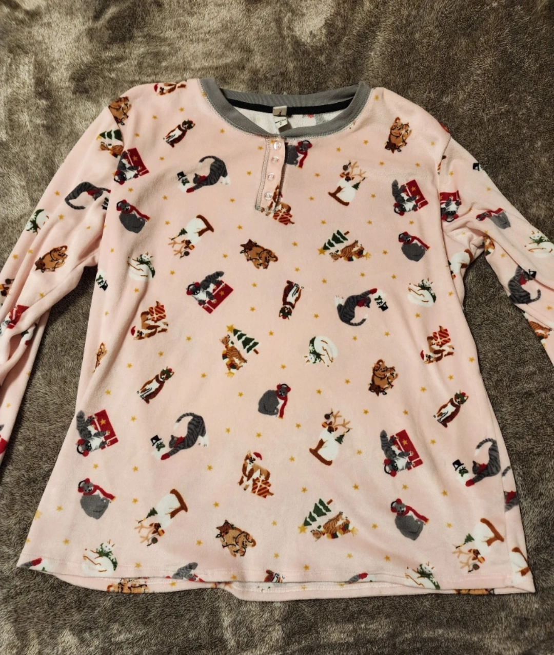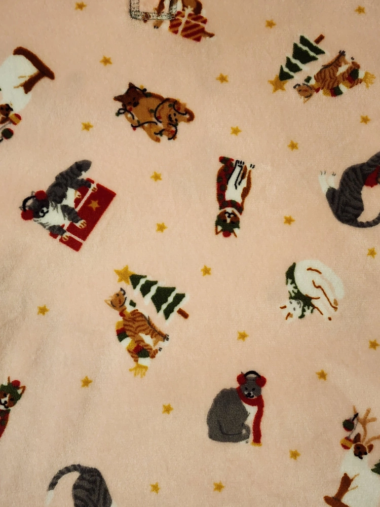 Set from Target. Was a gift but the legs are two short for me because I have long legs! Freshly washed too. Size small! Super soft light pink pj's with light grey cuffs on wrists and ankles. Crew neck top with buttons at the neck. It has the cutest cat design on it! Pick-up at Sheppard West subway station and cash only please :)