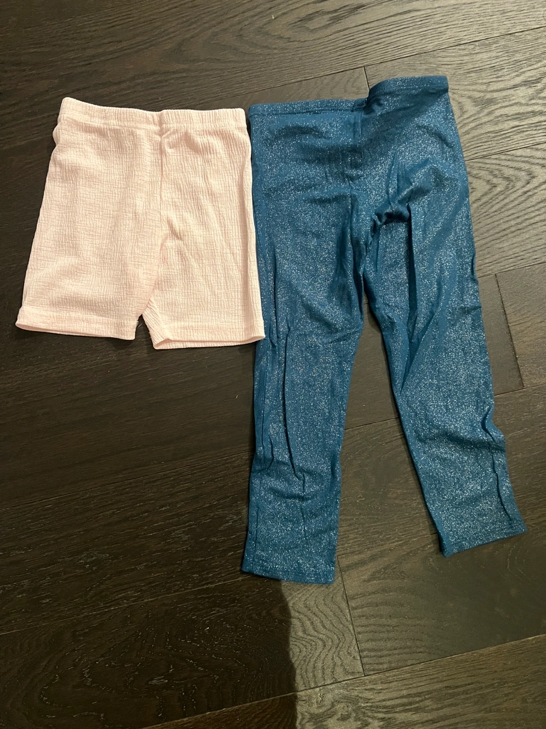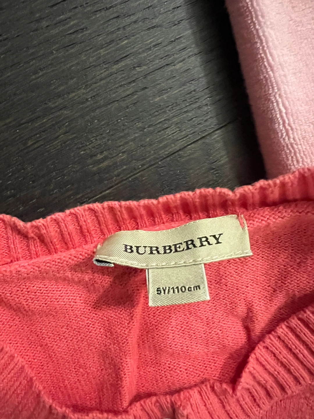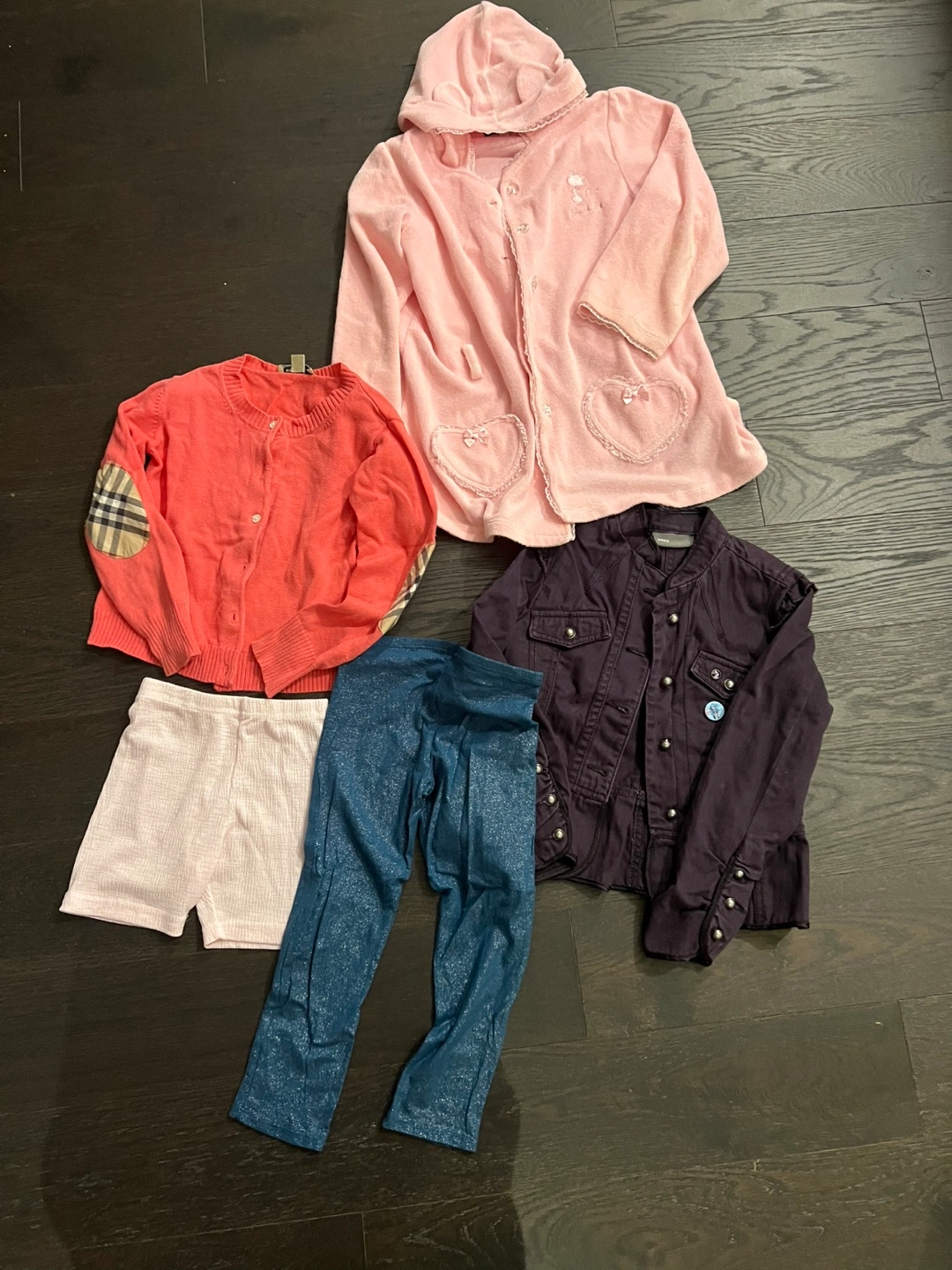 Bundle includes a pink hooded robe, pink shorts, blue/green sparkly leggings, pink authentic Burberry cardigan, and a purple denim jacket. All items are in good condition. The two bottoms are brand new. Size for 5 year olds. All for $15