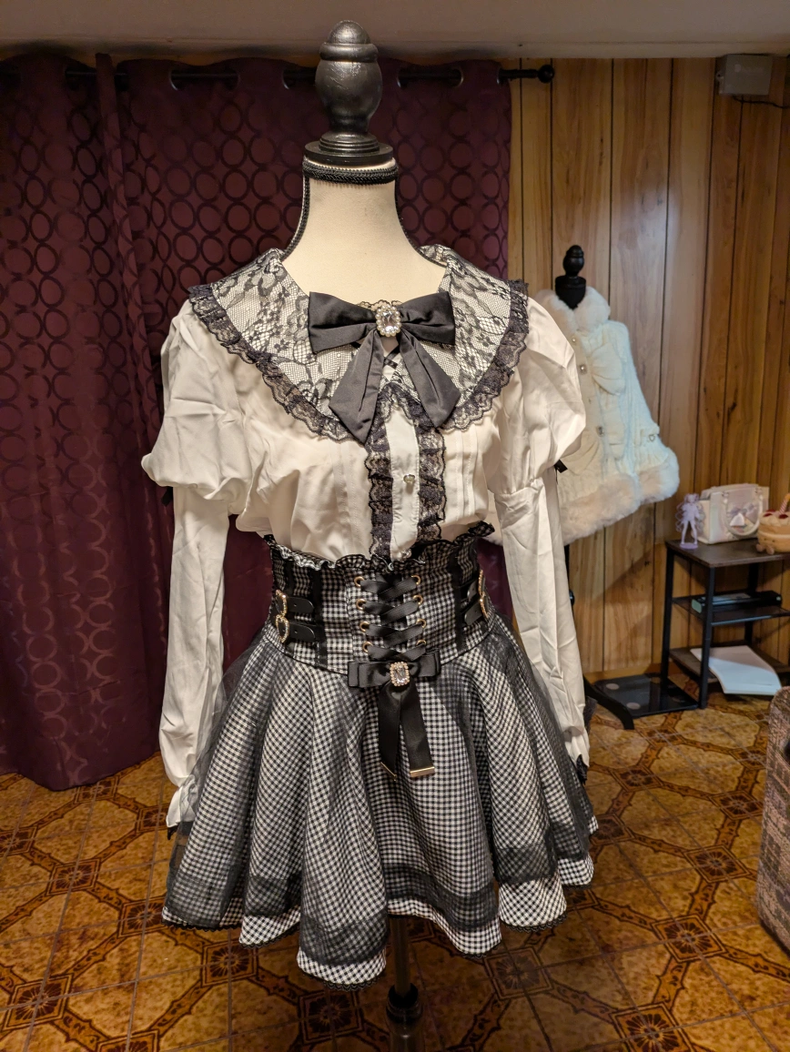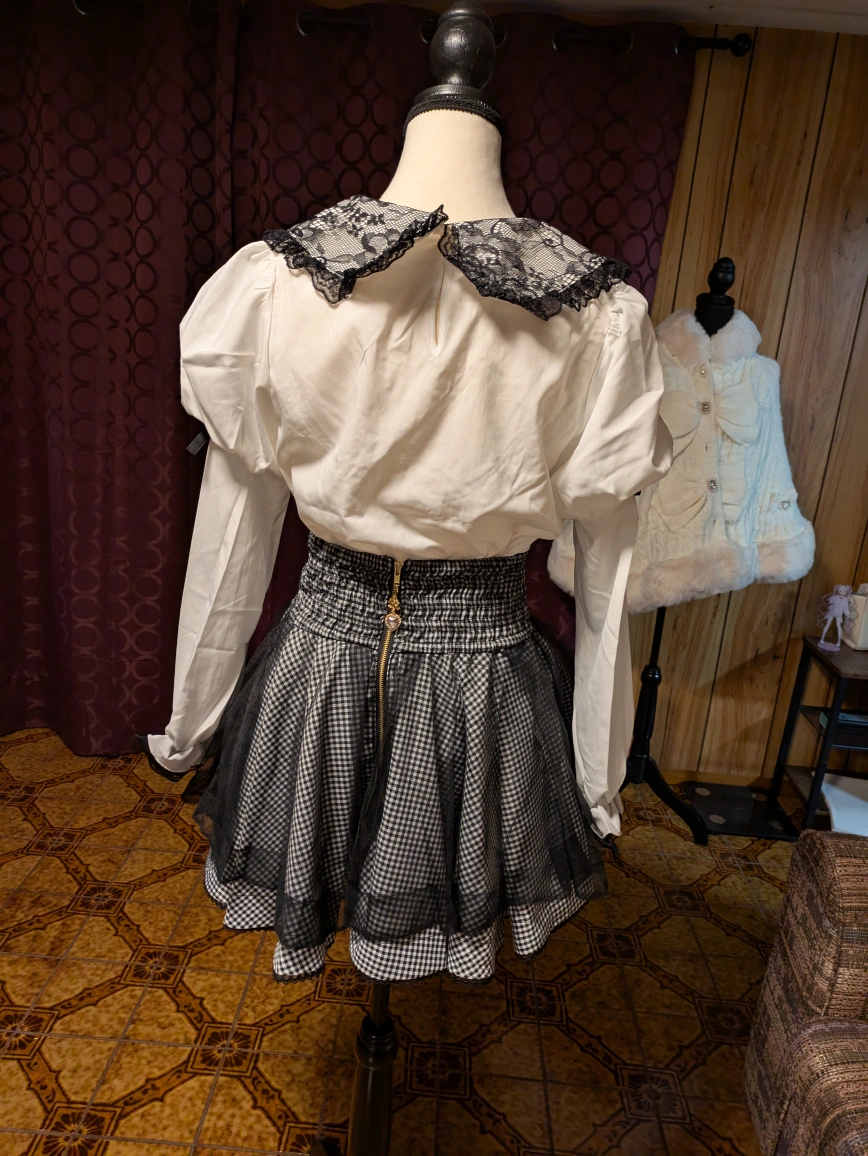 White Noémie blouse with black lace collar and long sleeves. Address: brimley & pitfield Porch pick-up, shipping and delivery available.