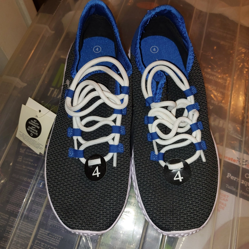 New grey running shoes with blue accents. White laces. Size 4. Fabric Sock Sneakers with memory foam insoles. Extremely comfortable. Can be tied or kept the way they are now for easy slip on and off.