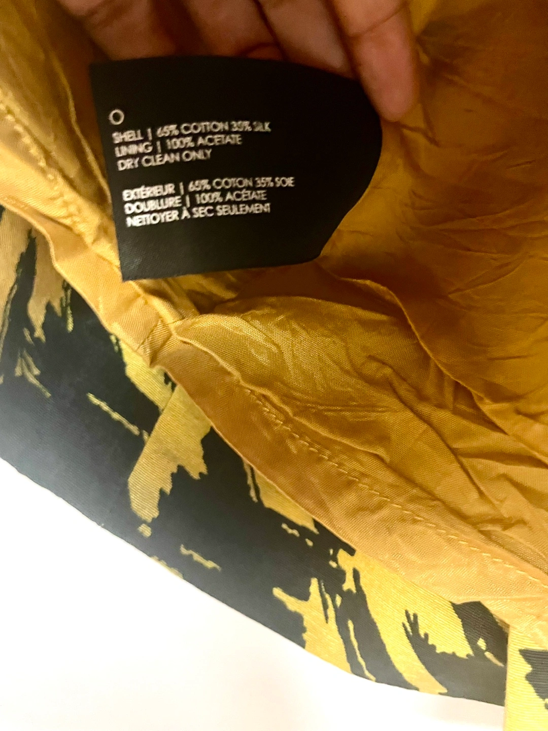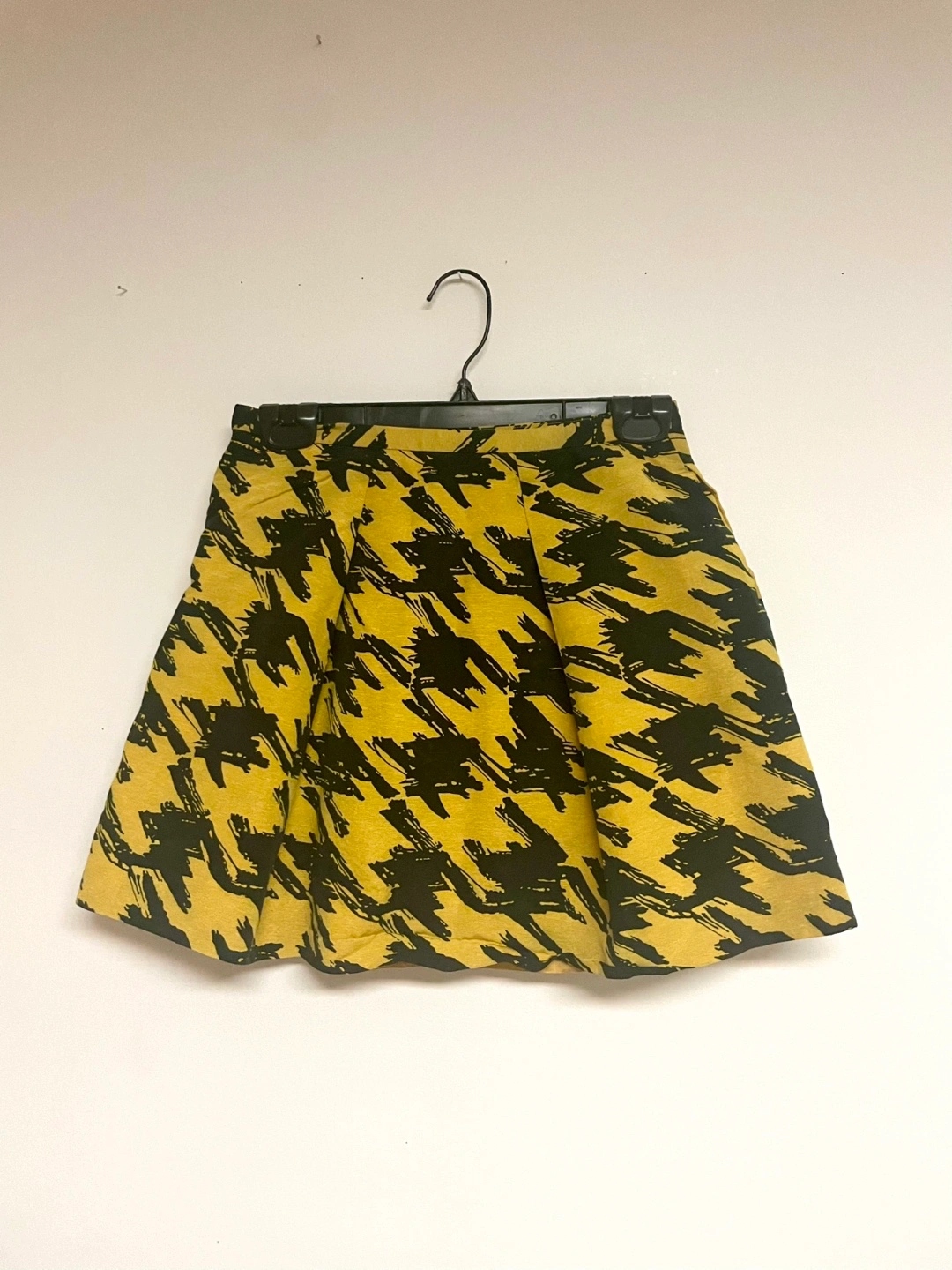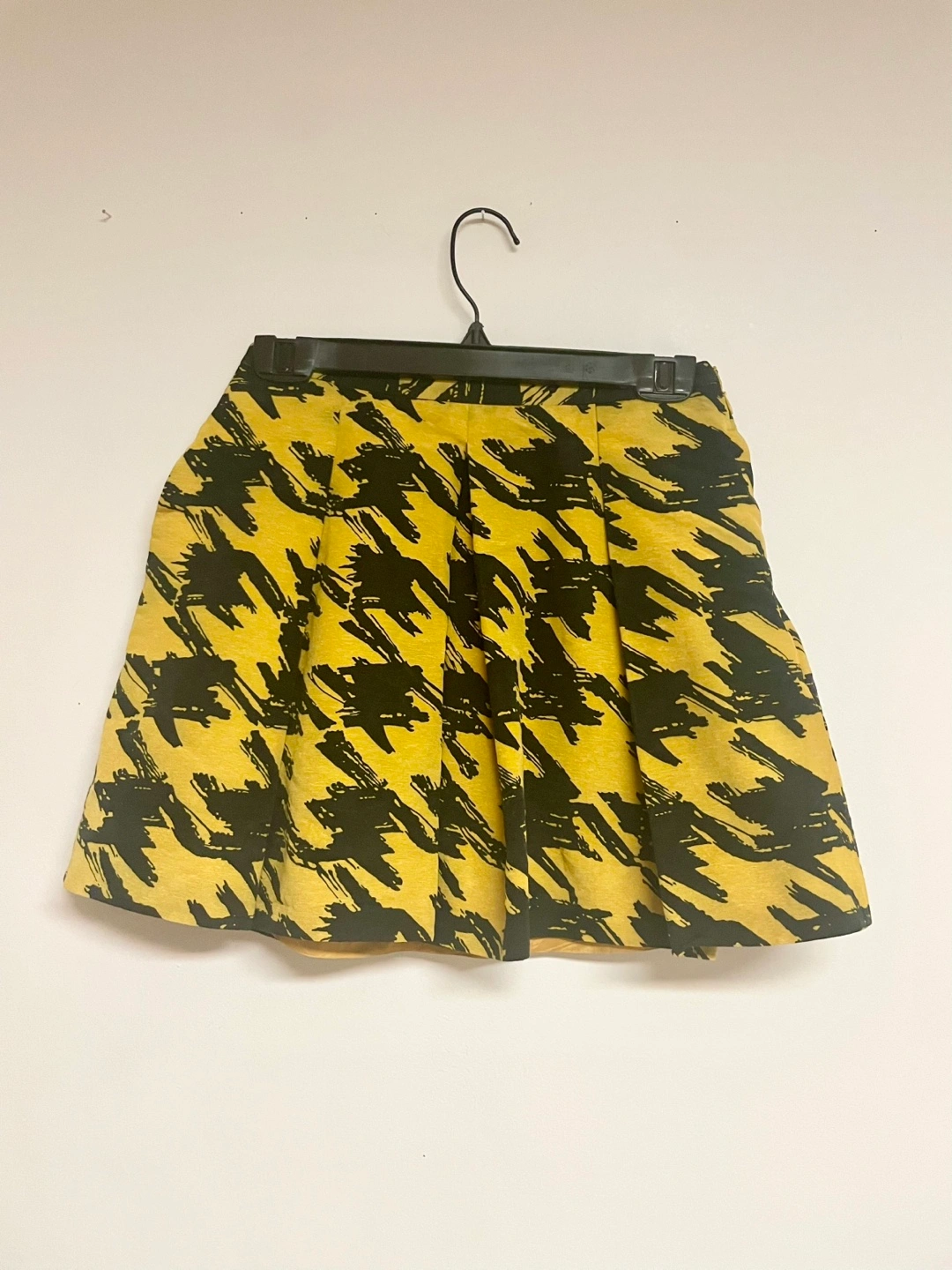 Pleated skirt with navy blue and yellow print Size - 00 Doesn’t fit anymore Preloved bit still lots life left Lined Dry clean only 60% cotton 39 % silk Has inside pockets and zip closure Runs above knee length approx - 12 inch Can send the measurements on request Price is firm No low ballers please 🙏 Cash please