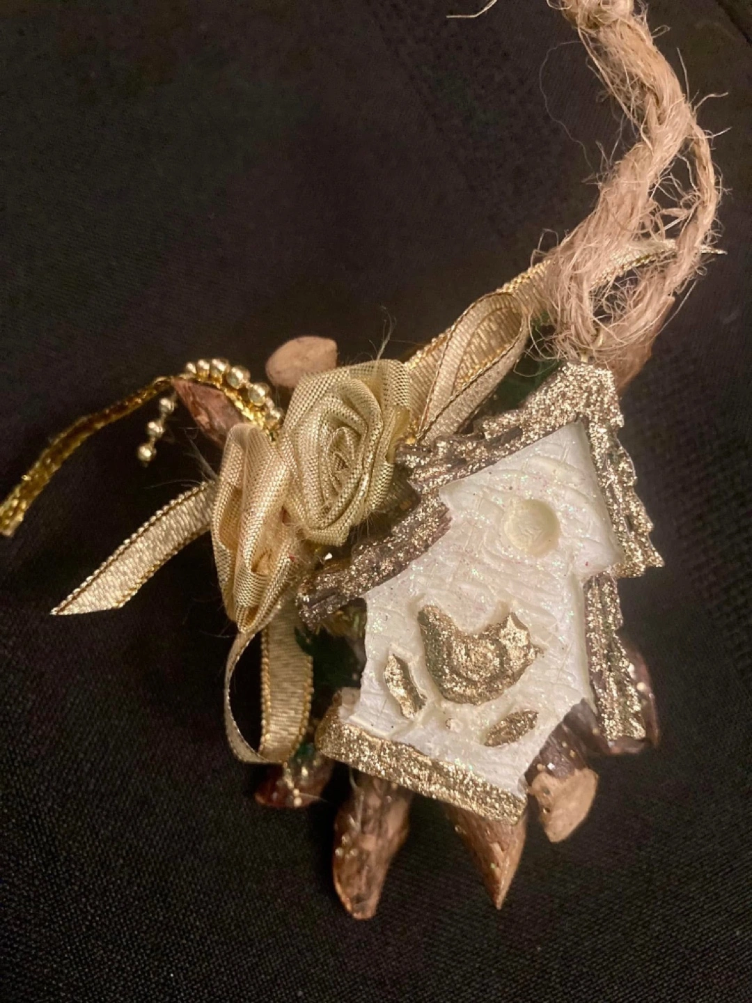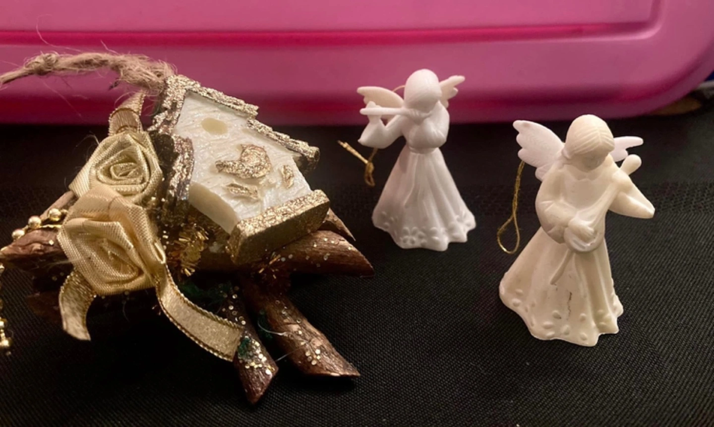 Set of three Christmas ornaments. One is a birdhouse and two are angels. Each has a gold cord for hanging. 3 Christmas ornaments , in excellent condition , from a smoke-free home . Pick up In Woodstock , close to Fanshaw College. $1 FIRM, Cash only