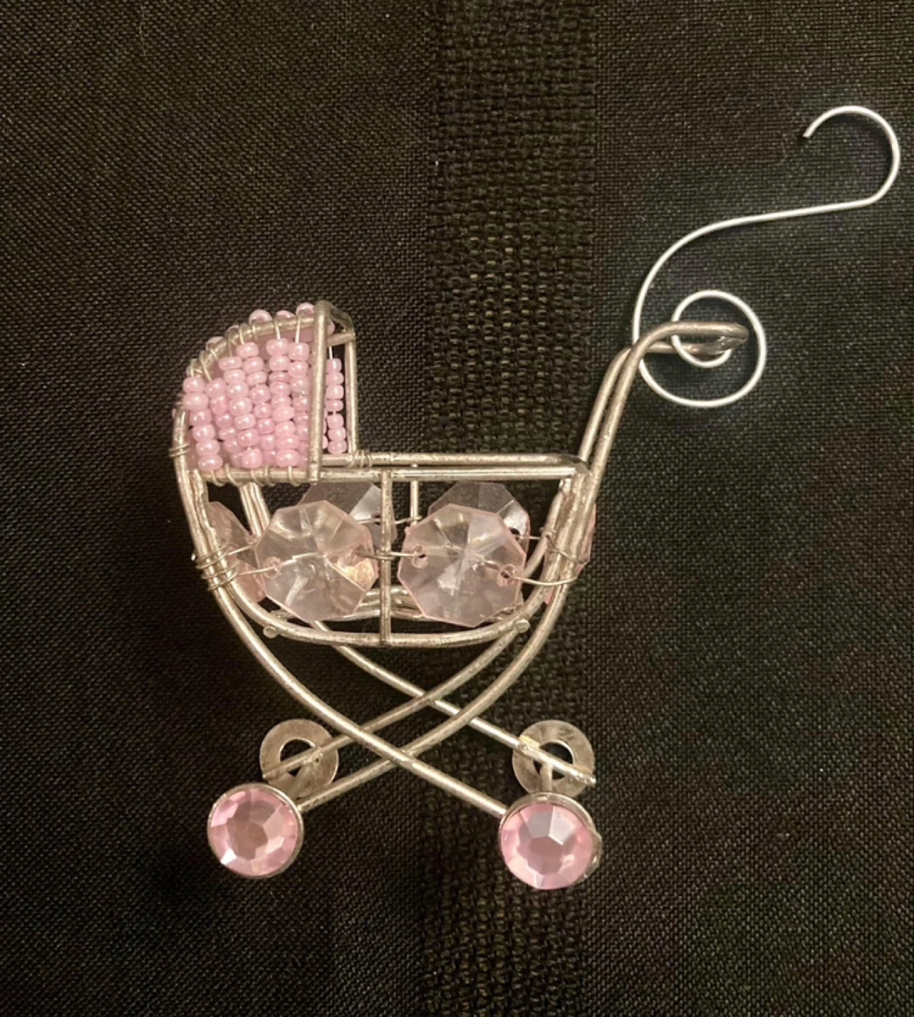 Silver wire baby carriage ornament with pink beads and crystal accents. Hanger on top for hanging on a tree or other decor. Christmas ornament baby carriage . In excellent condition , from a smoke-free home . Pick up In Woodstock , close to Fanshaw College. $1 FIRM, cash only.