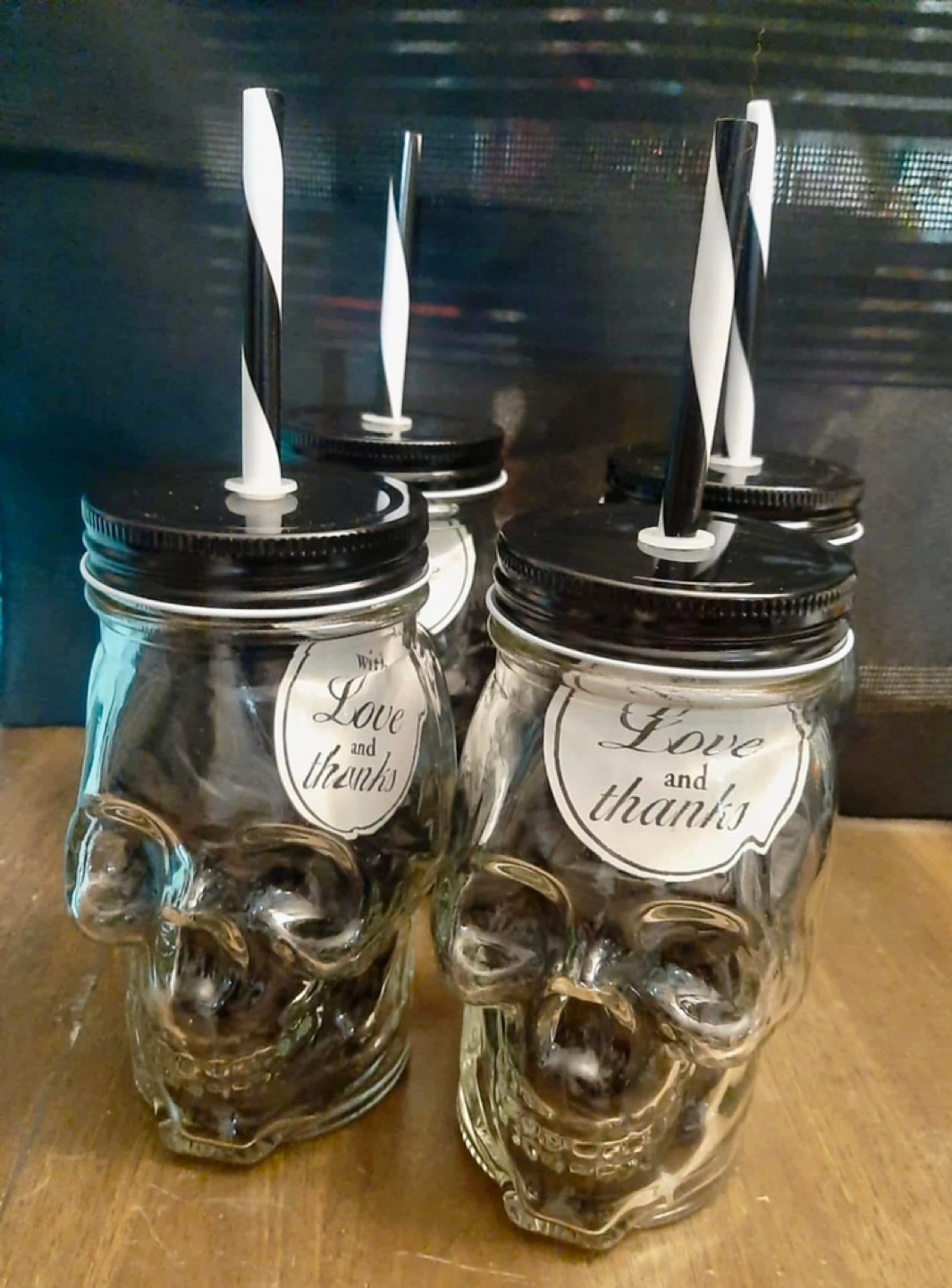 Set of two glass mugs. Skull shaped, with black lids and black and white striped straws. Brand new 14 glass skull π mugs with straws & lids ( only showing 4 in picture but there are 14 all together ) . 6β height for mug & 9β in height from top of straw . From a smoke free home. Pick up In Woodstock , close to Fanshaw College. $40 FIRM , cash only .