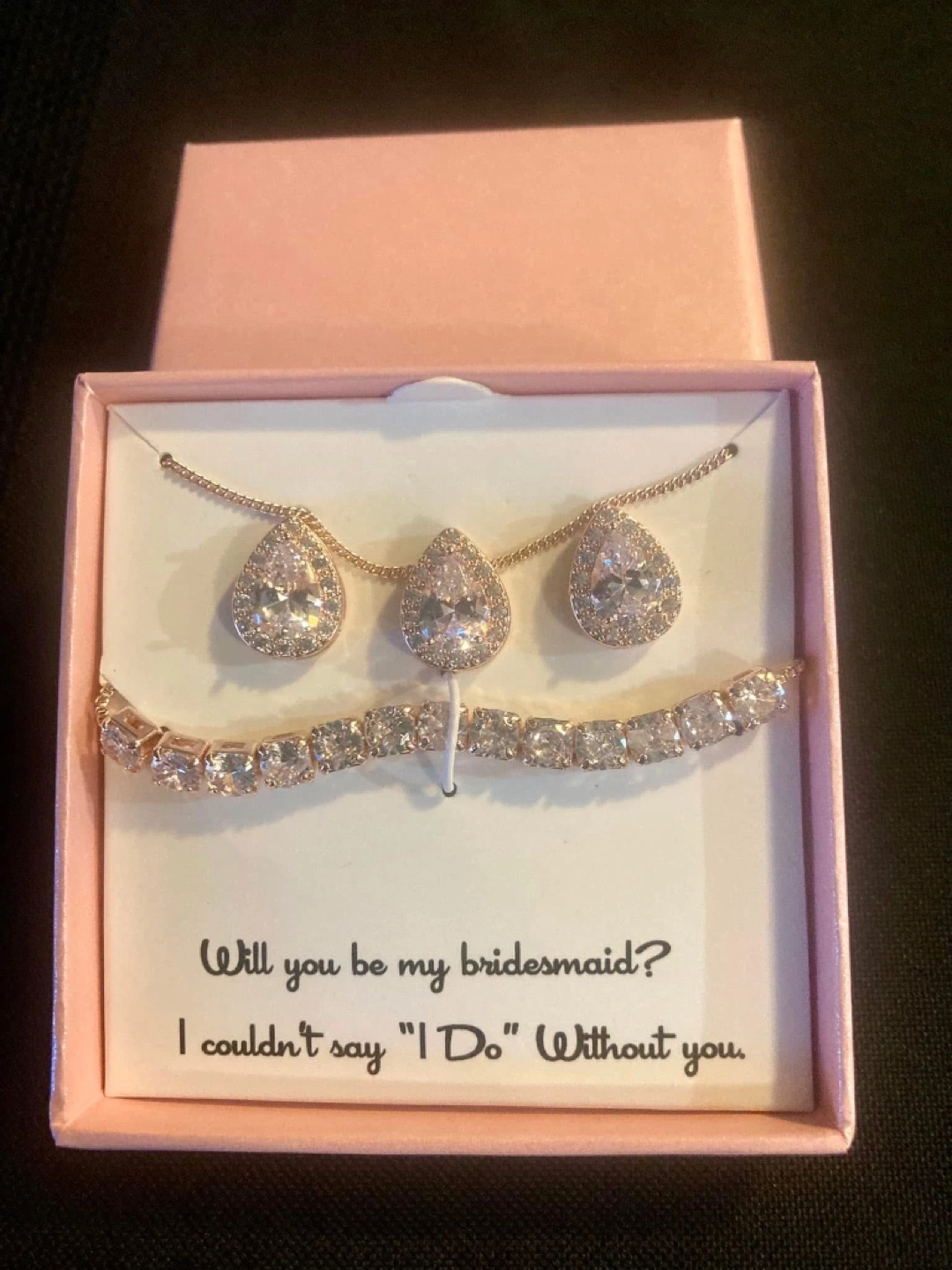 Necklace, earrings, and bracelet set. Rose gold with clear stones. Brand new bridesmaid gift 🎁 . Set includes earrings, necklaces & bracelet , costume jewelry. From a smoke-free home . Pick up In Woodstock , close to Fanshaw College. $20 FIRM , cash only.