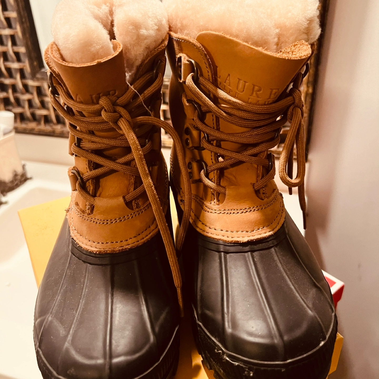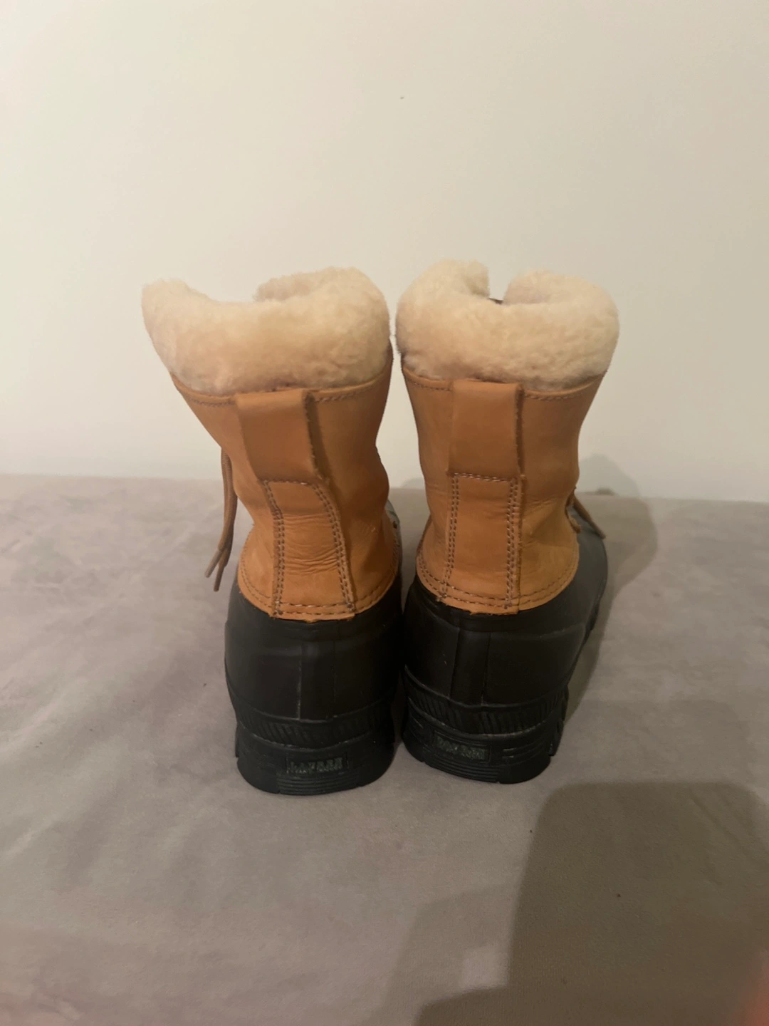 Women's winter boots. Lace up, black rubber soles, tan leather uppers, with a soft, fluffy interior.