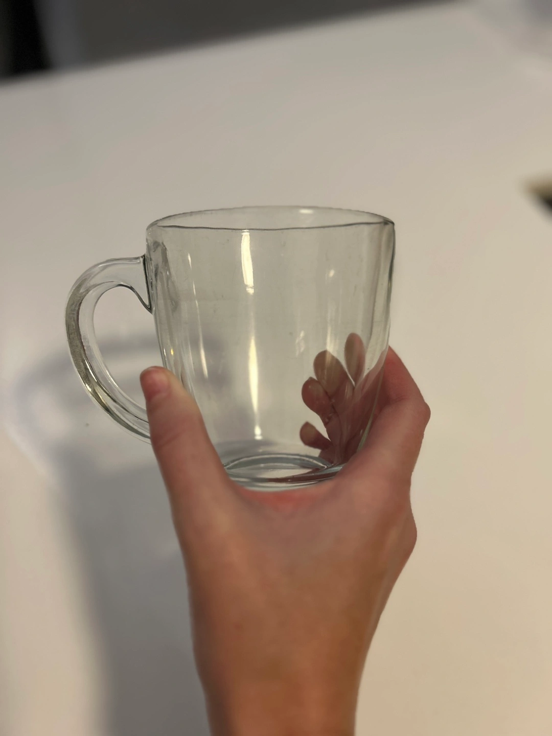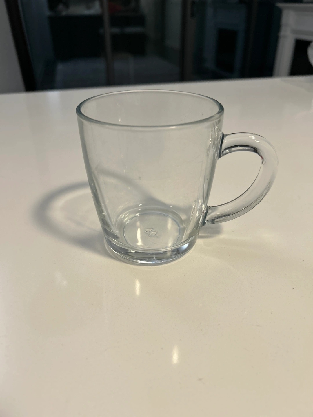 Clear glass mugs with a handle, one large, one small.