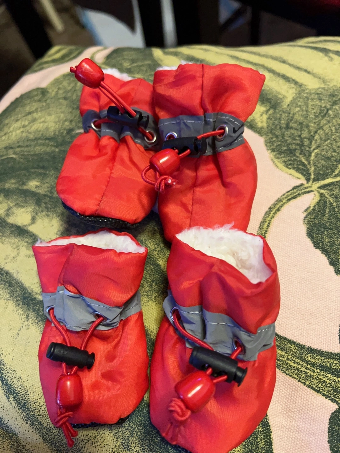 Red dog boots with reflective strips and adjustable straps. They are waterproof and have a fleece lining. Great for small breed.