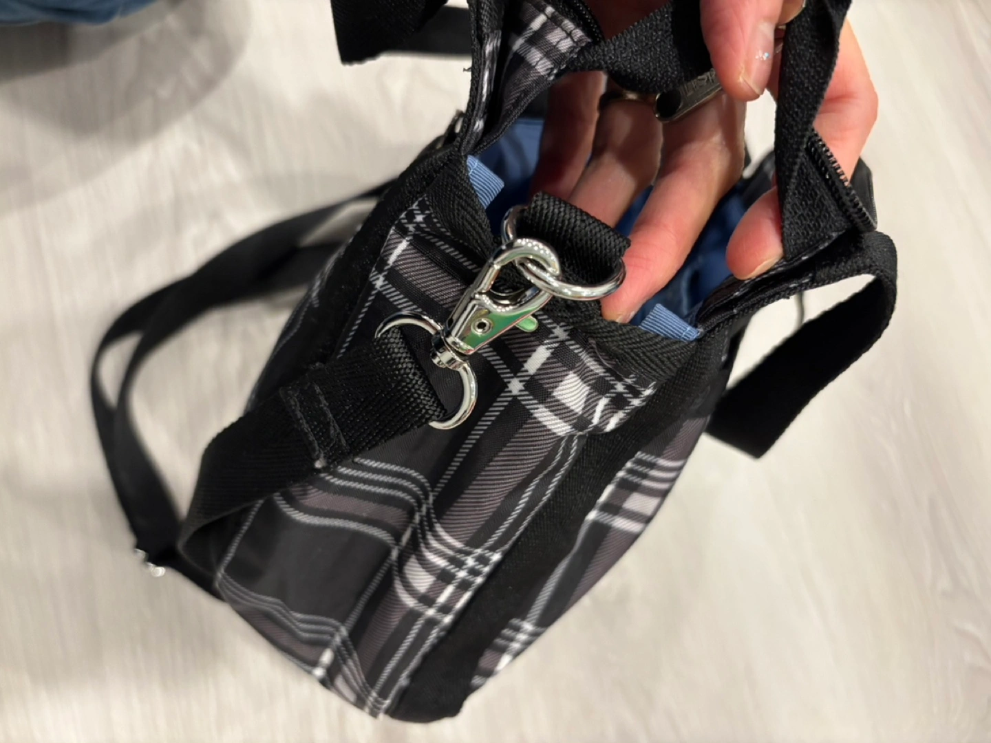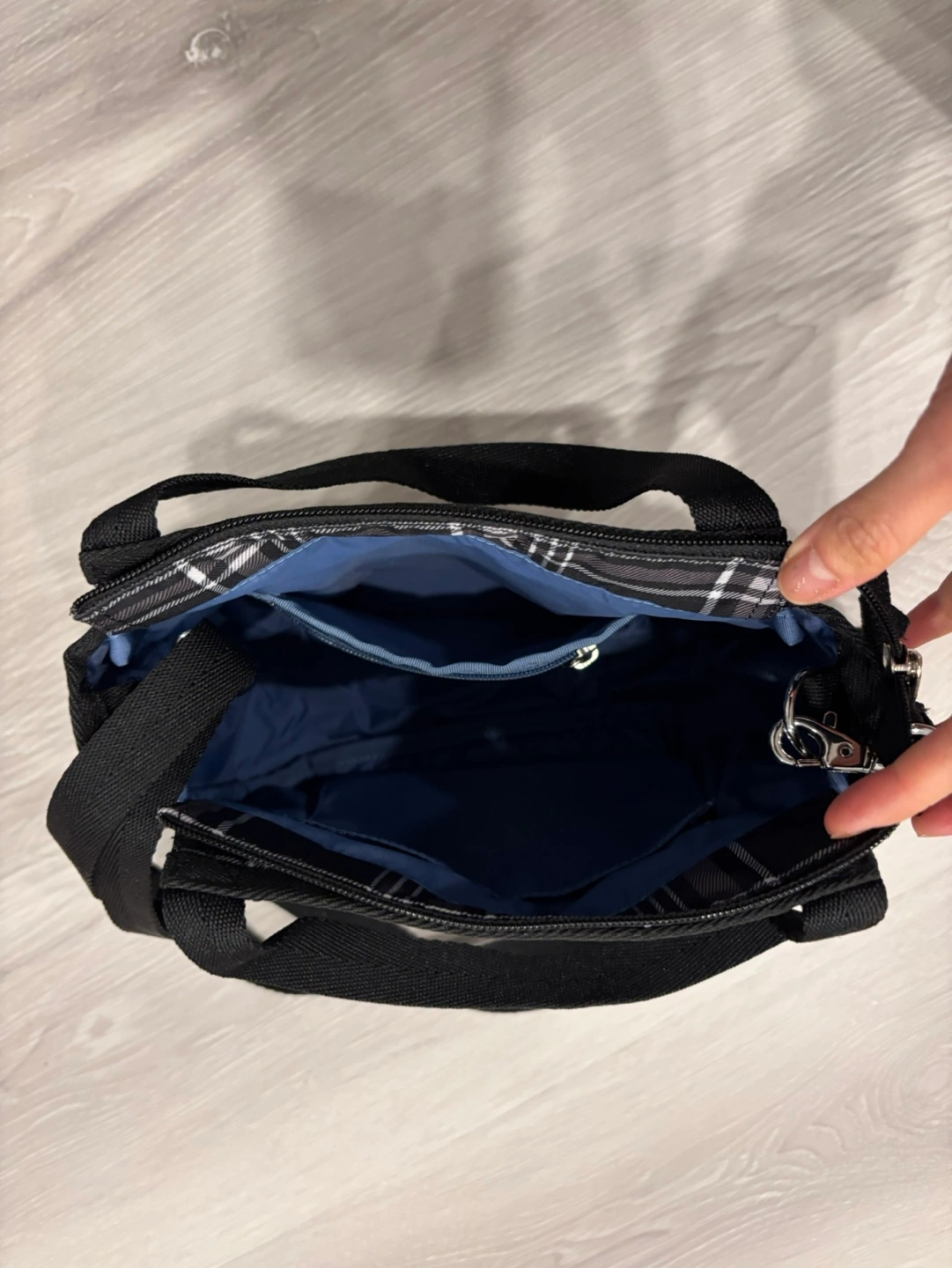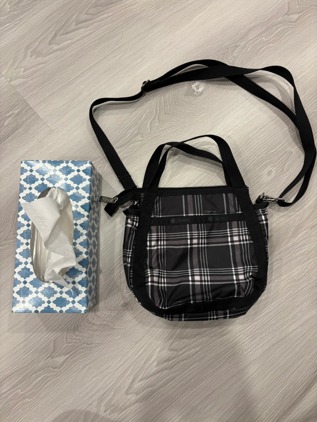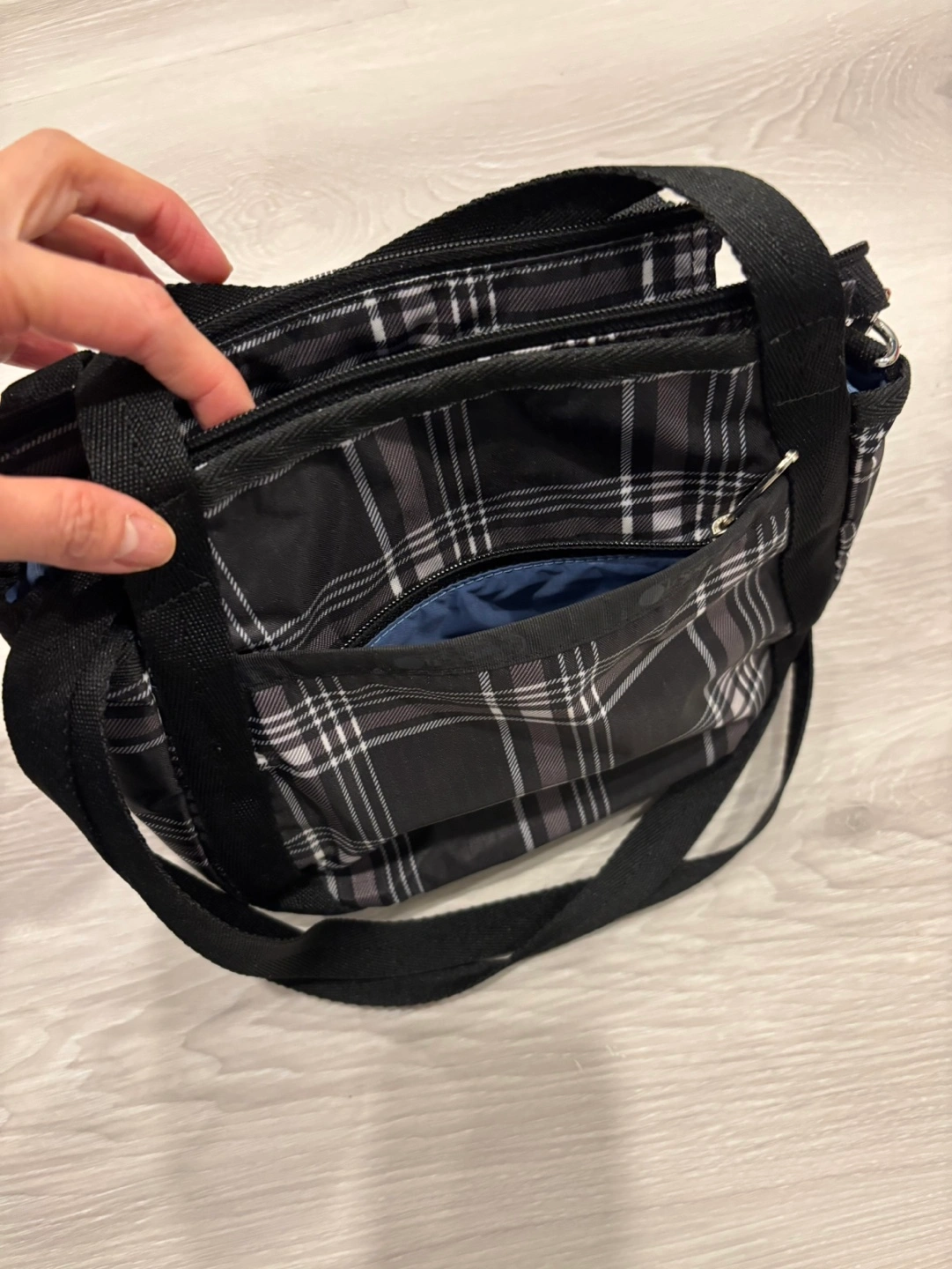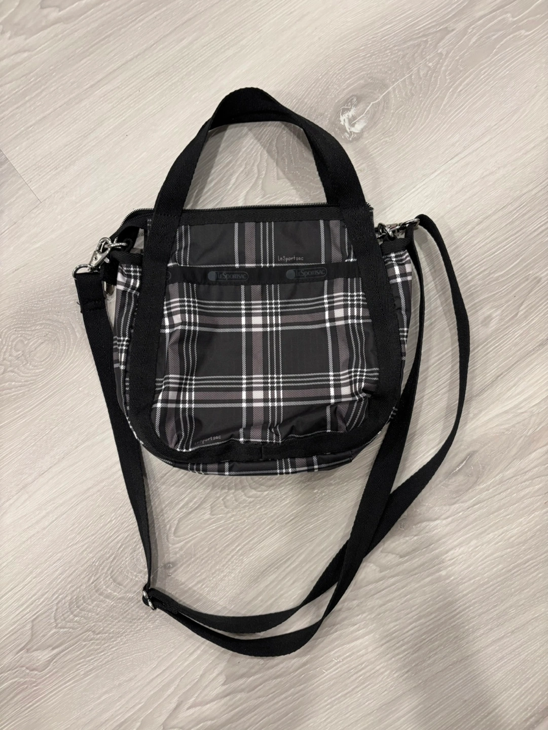 Smoke free pet free home Pick up only. Yonge & Steeles Item brought to driveway Detachable strap to convert to hand held bag Classic pattern which also works as a work purse Black and white plaid crossbody bag. Includes a long strap and short handles. Features several zippered compartments and a small pocket inside.