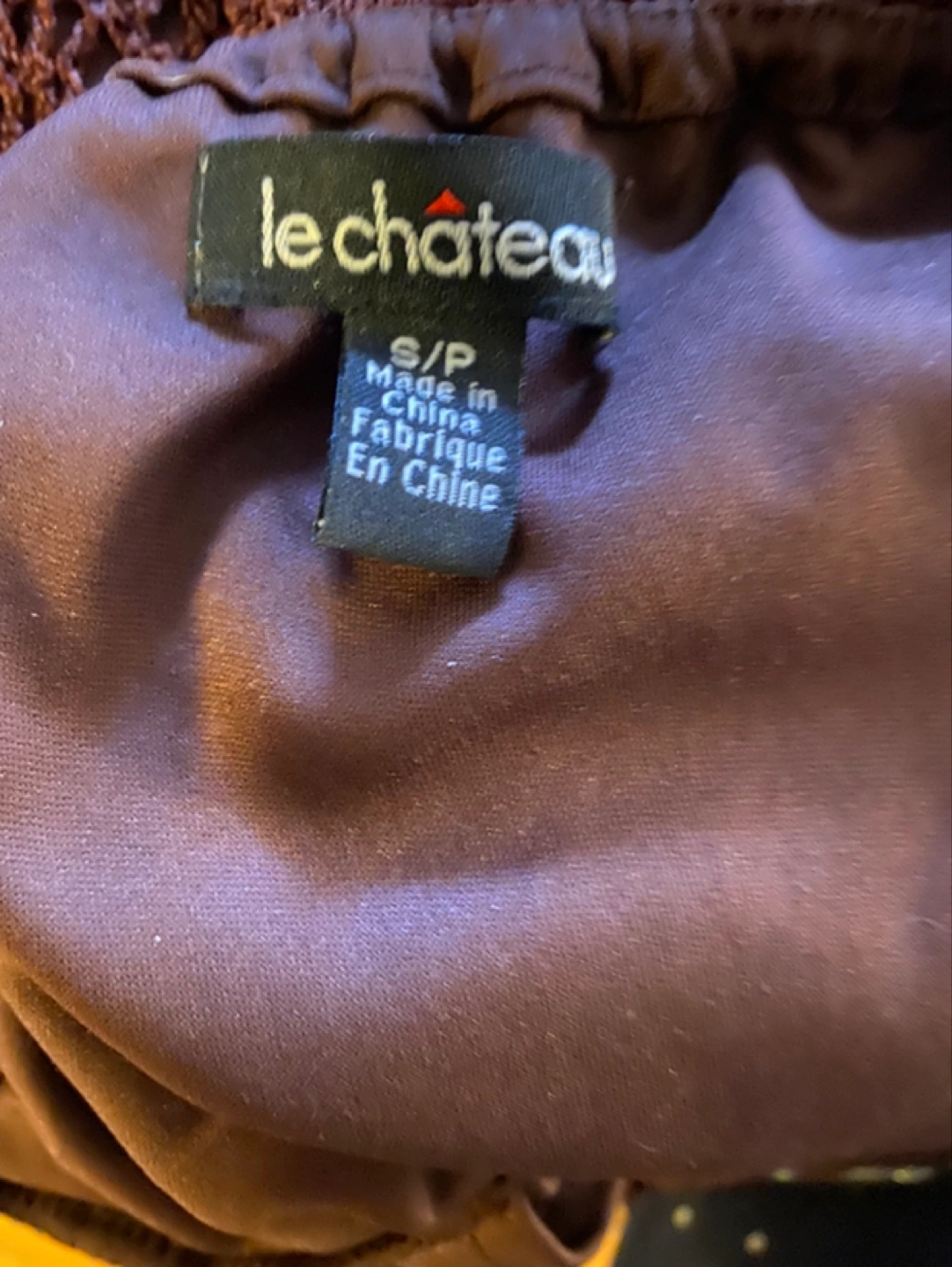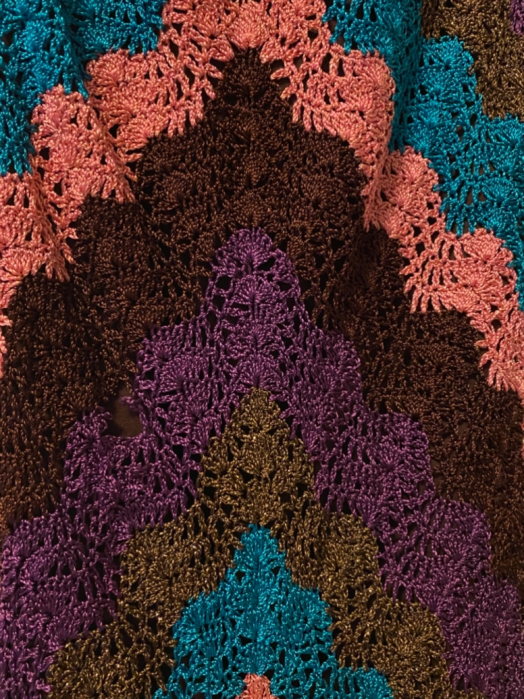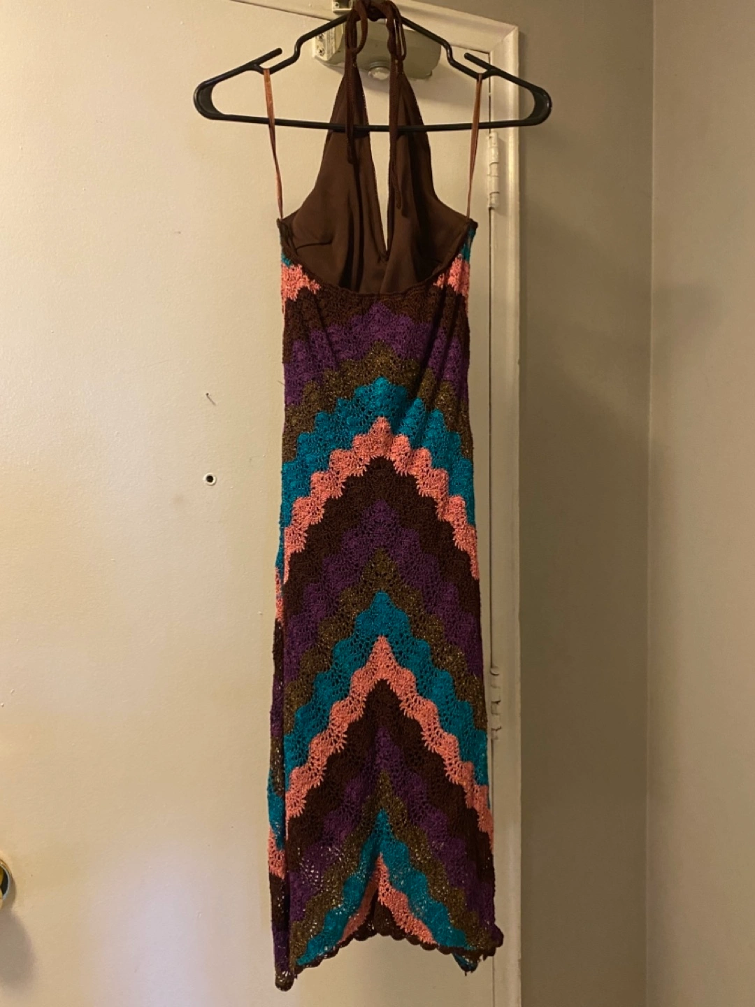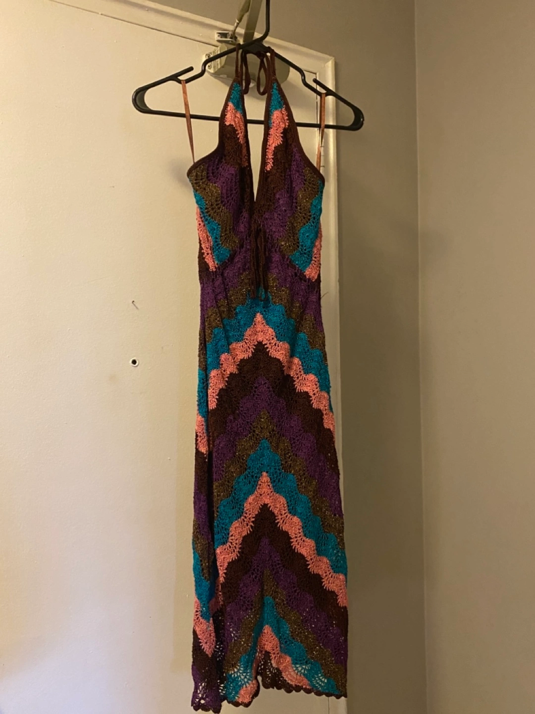 Beautiful crochet halter dress. Brown, teal, pink, and purple.