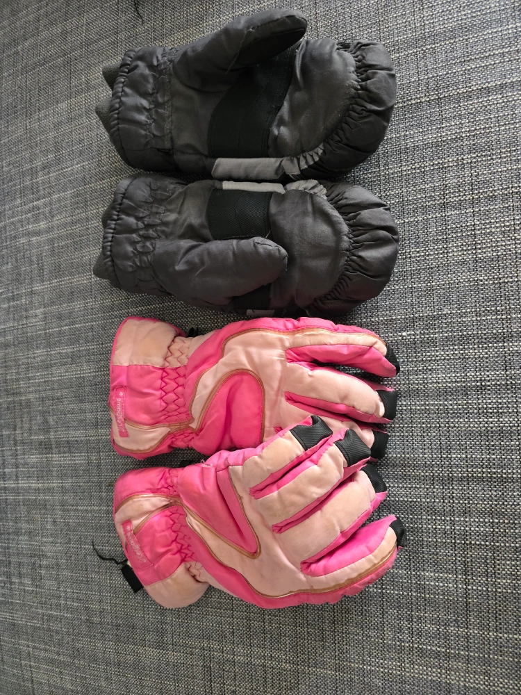 Two pairs of winter gloves. One pair is grey with silver stripes and the other is pink. Both are in good condition for a kids 10-12 yars old