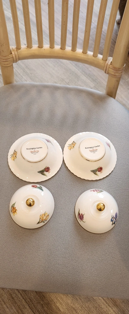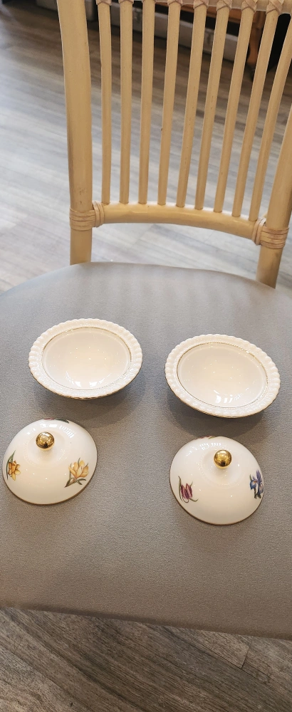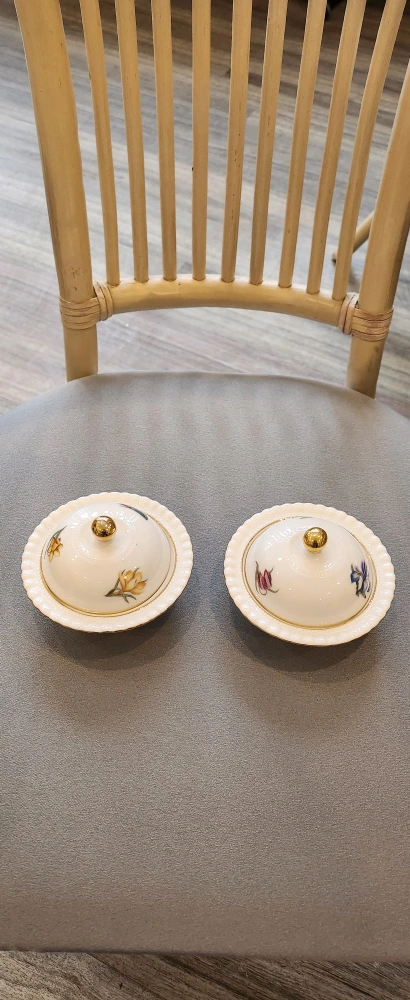Set of 2 porcelain butter dishes. Each dish has a lid. Floral pattern.