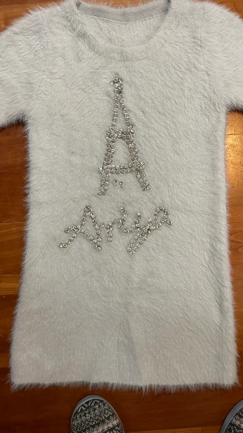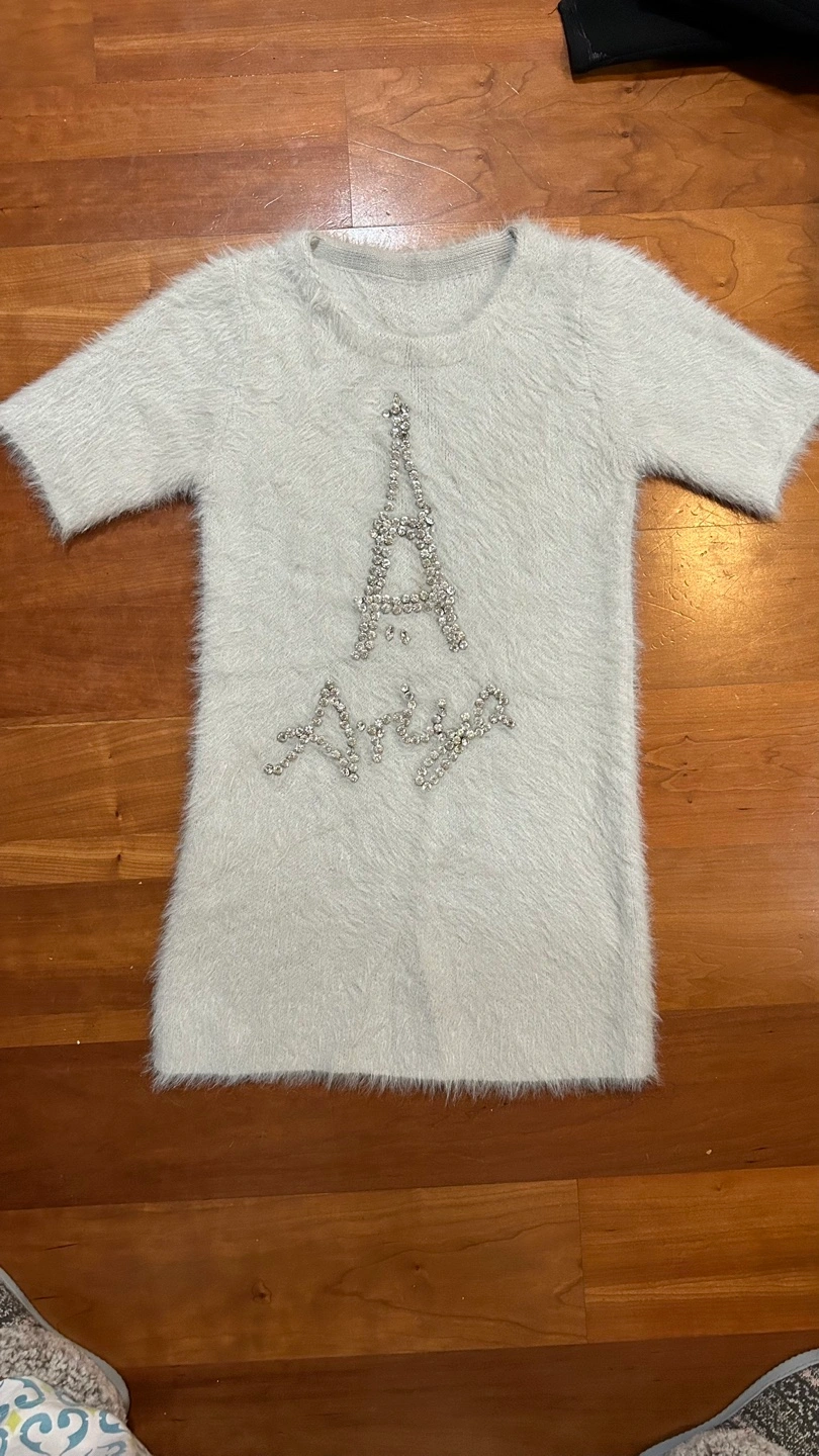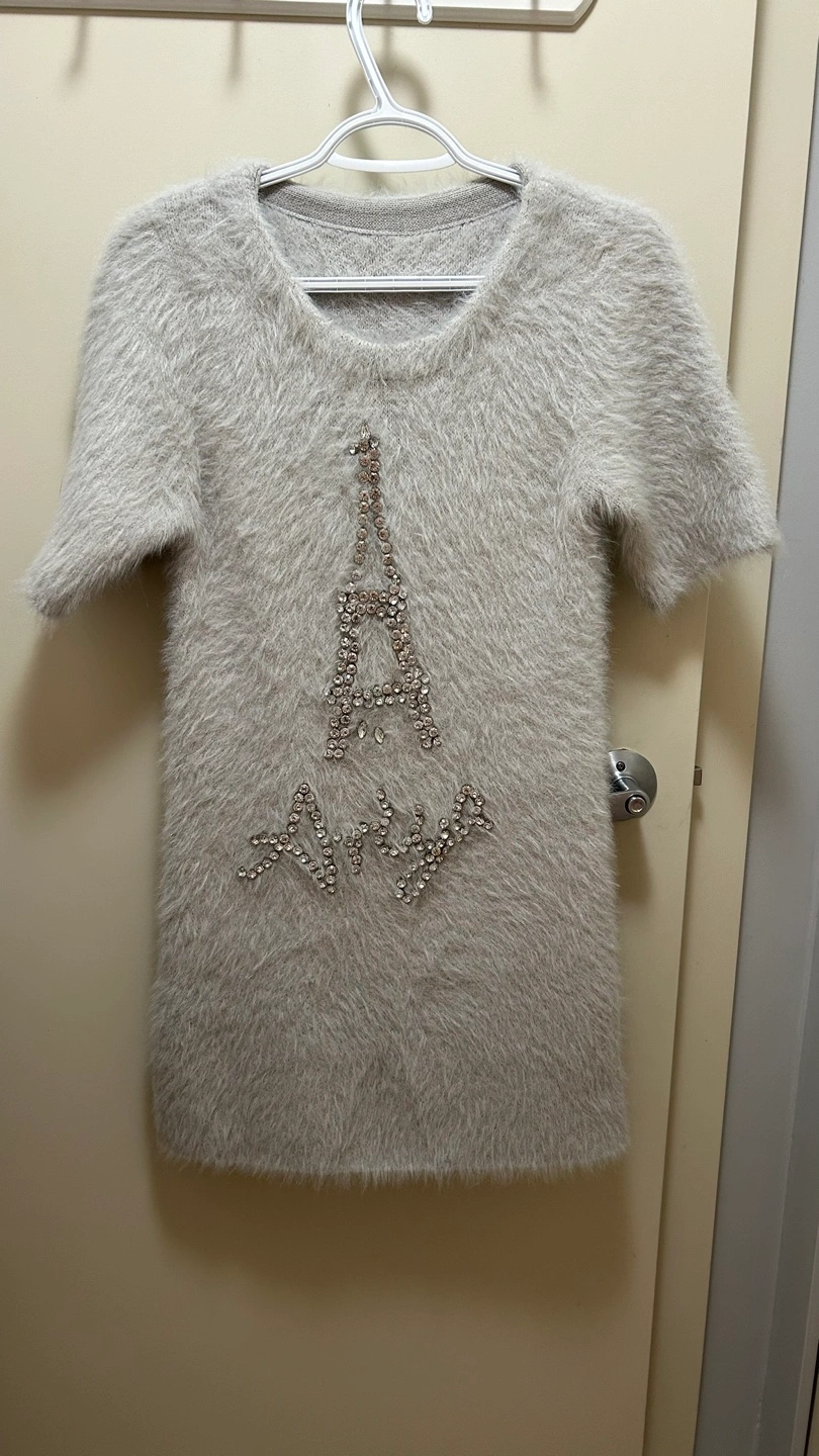 Fuzzy, light grey sweater with Eiffel Tower design on the front. Short sleeves. Size M.