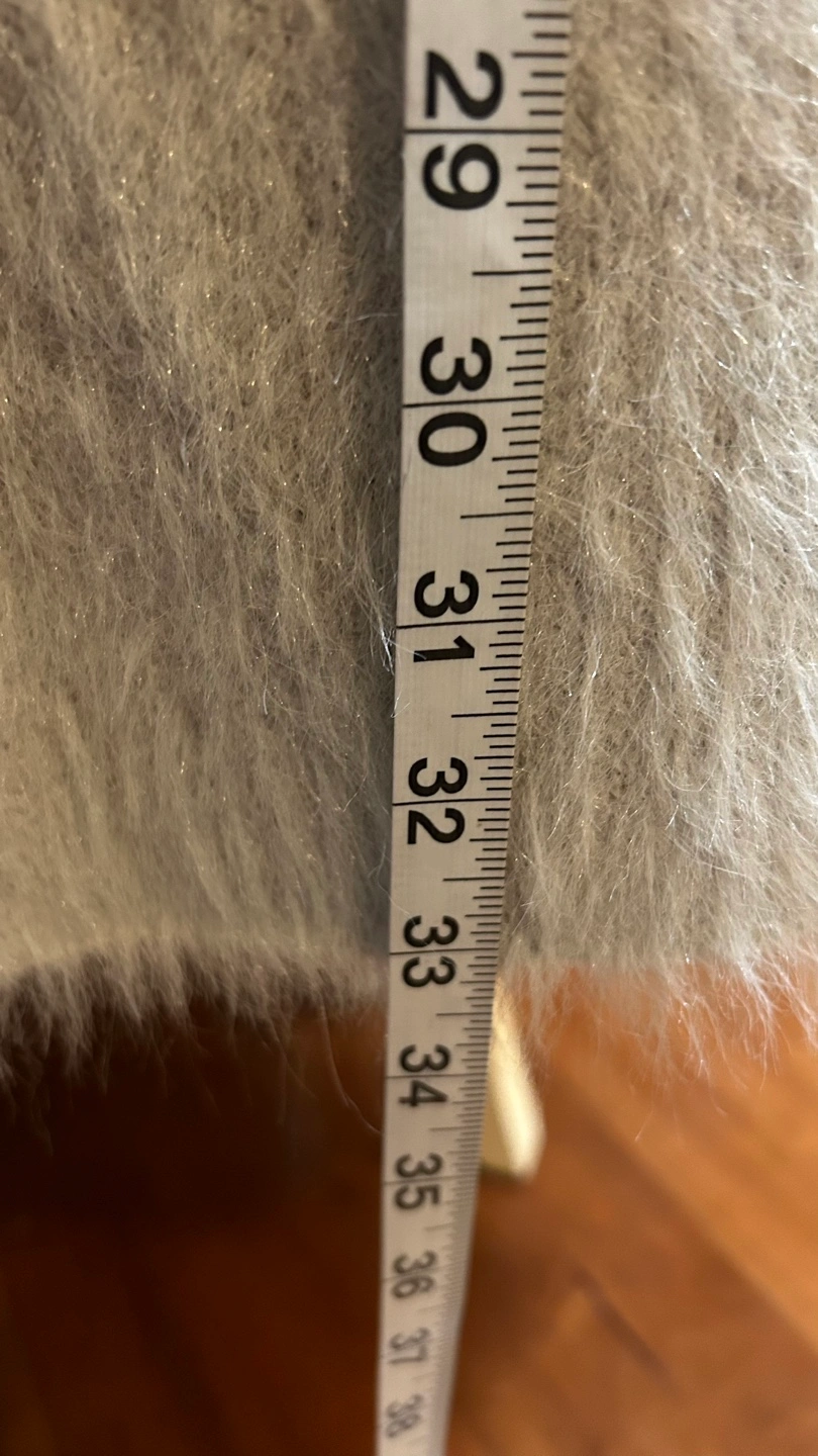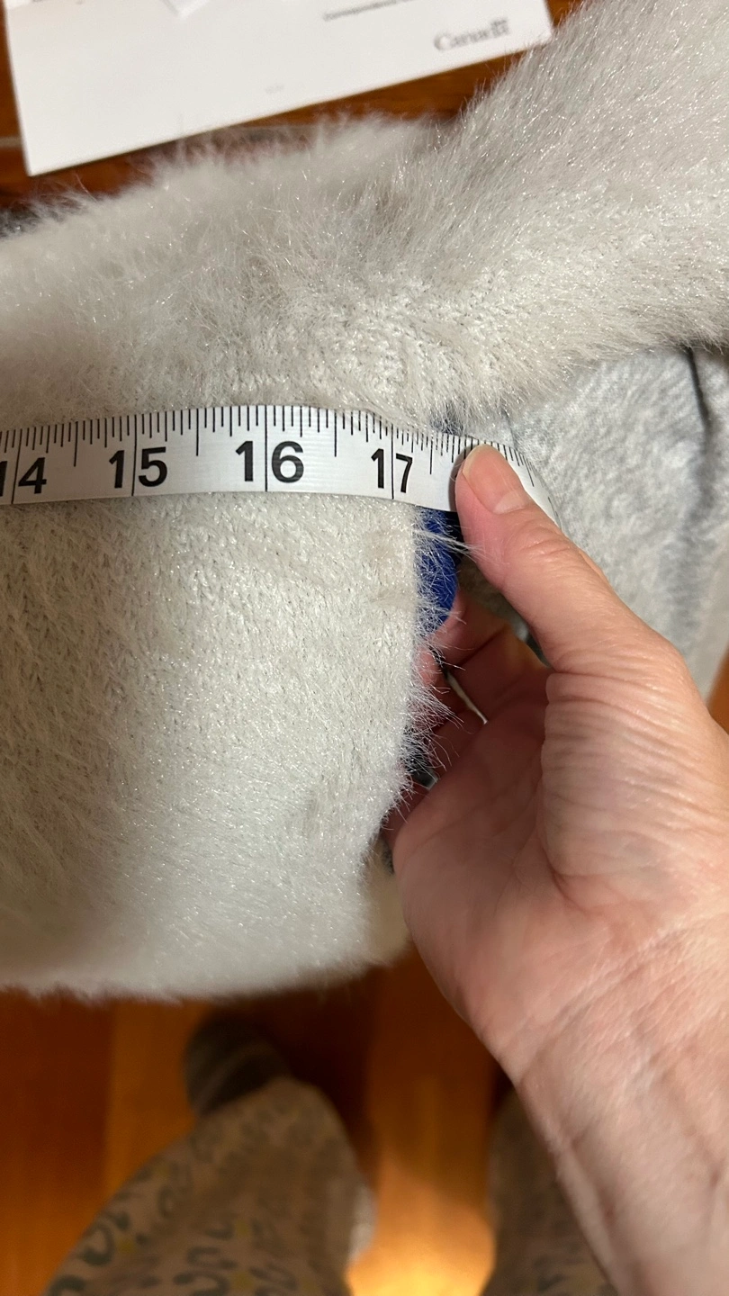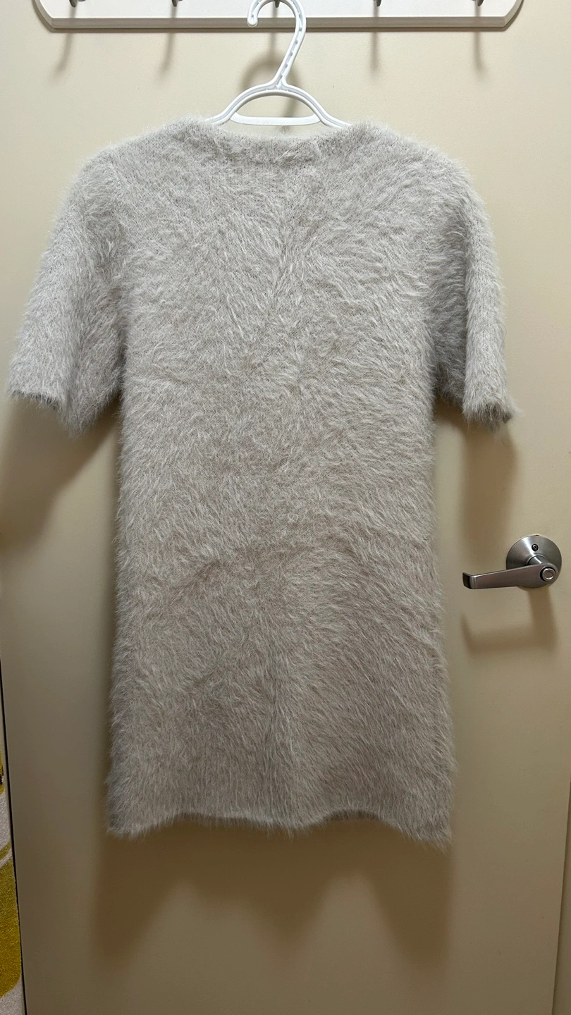 Fuzzy, light grey sweater with Eiffel Tower design on the front. Short sleeves. Size M.