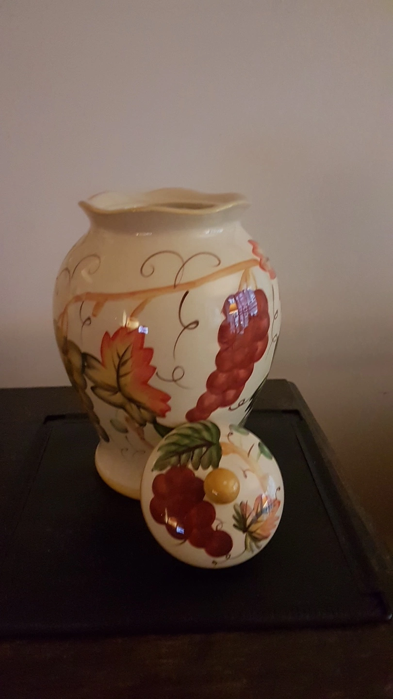 Large Hand painted Tuscan Ceramic Canister, Jar w/ Sealing Silicone Seal Lid. Perfect for storing cookies, biscotti and other pantry items. Good condition. Small chip on the lip of the lid.