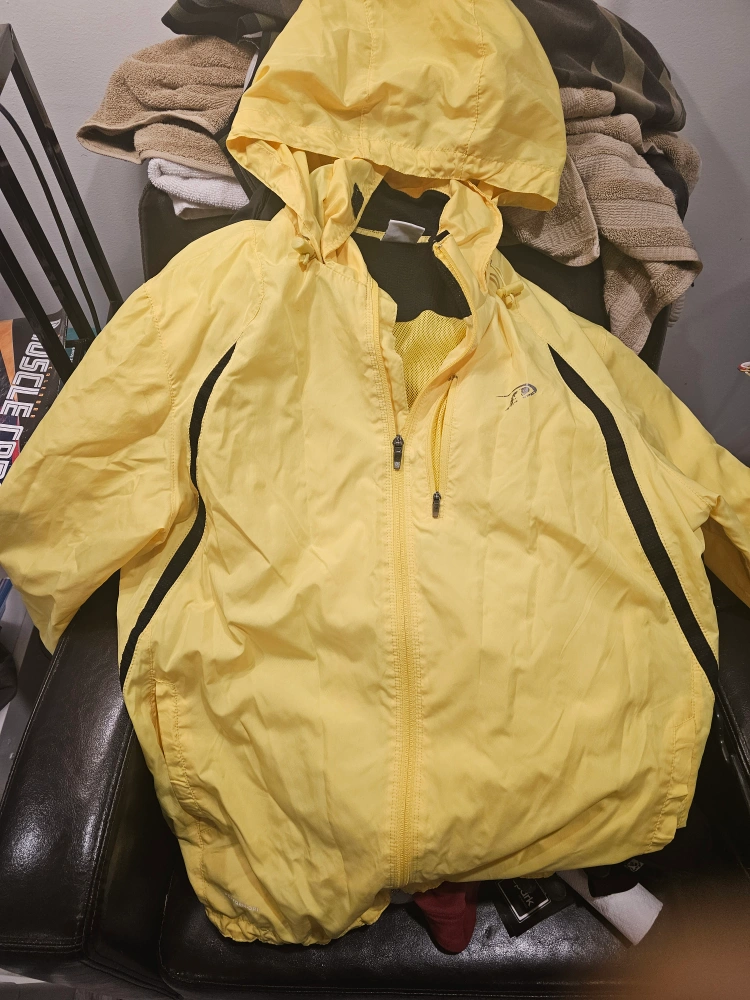 Lightweight yellow jacket with black accents. Features a hood, zipper closure, and pockets.
