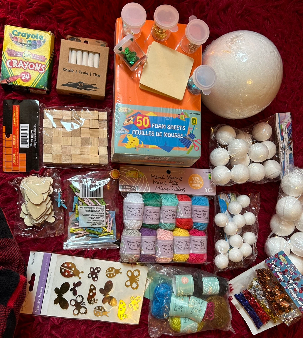 Large bundle of craft supplies, includes yarn, foam balls, sequins, wooden shapes, and more.