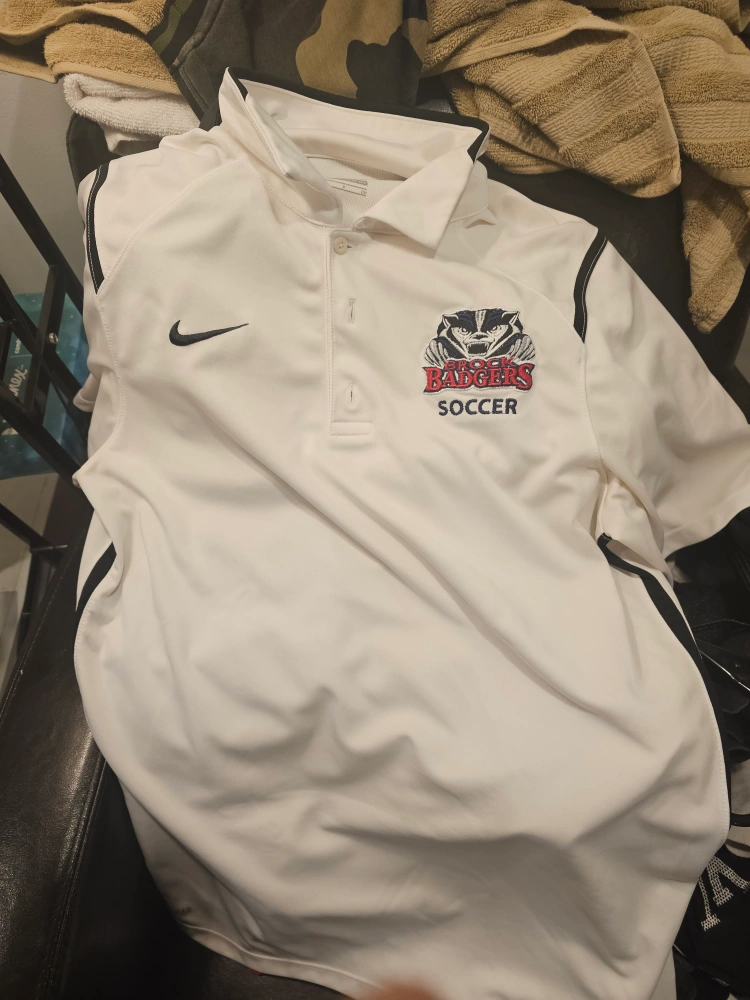 White polo with black trim. Features a badger logo and "Brock Badgers Soccer" text.
