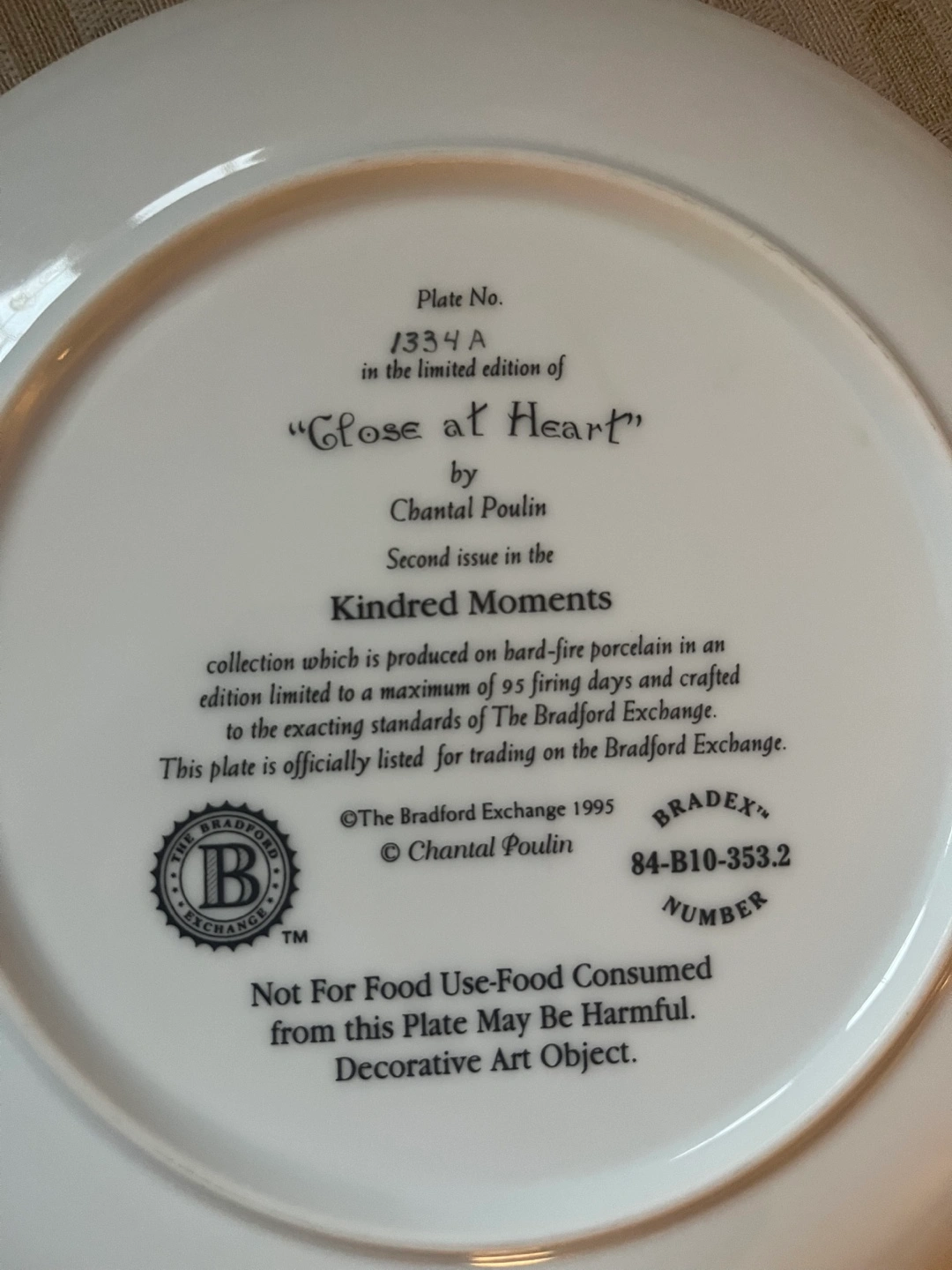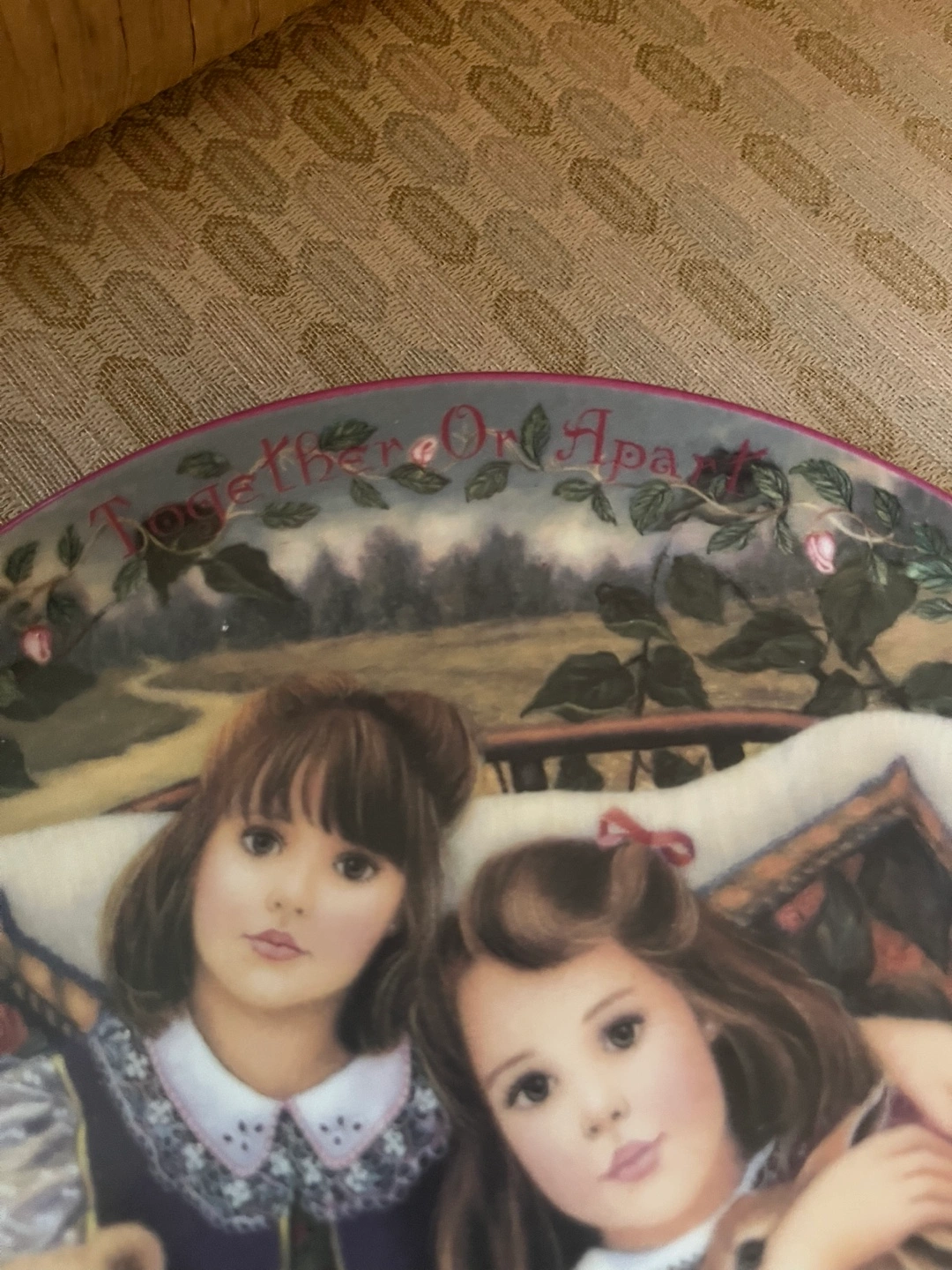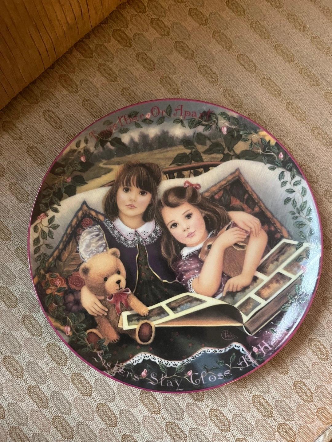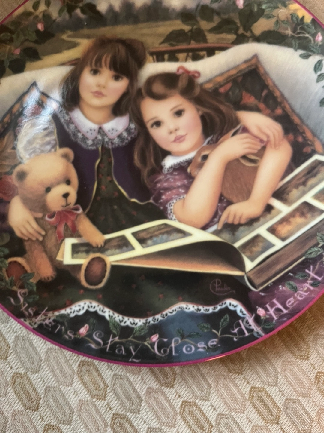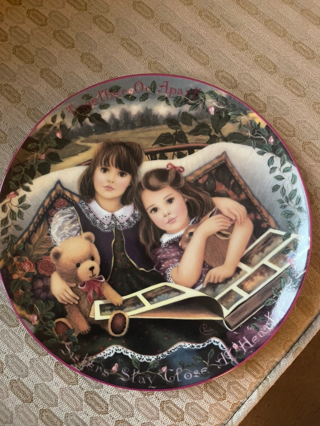 Chantal Poulin 'Close At Heart' decorative plate. Second issue in the Kindred Moments collection. Features image of sisters with a teddy bear and says “Together or apart, sisters stay close at heart.” Available for pickup in Markland Wood.