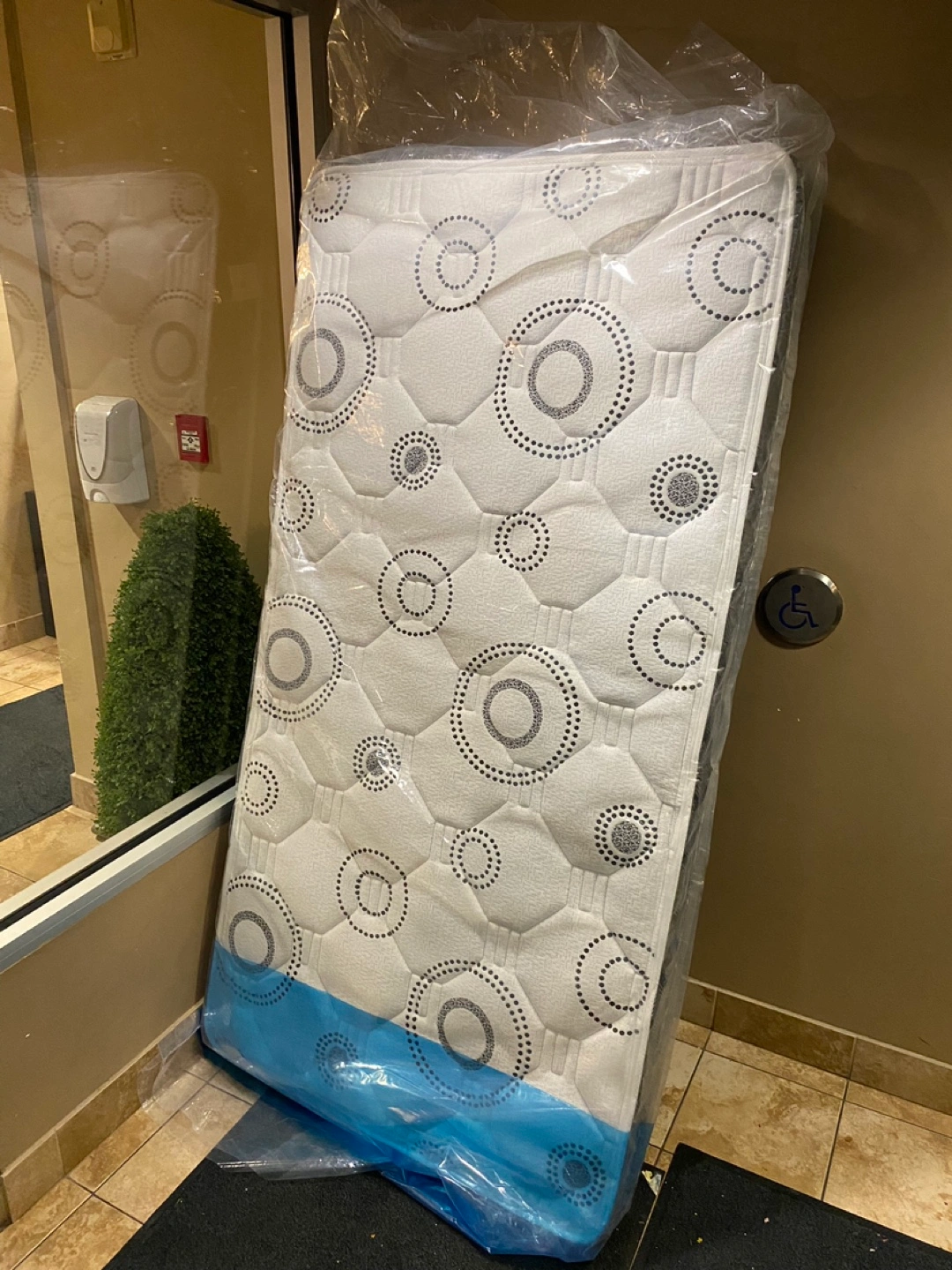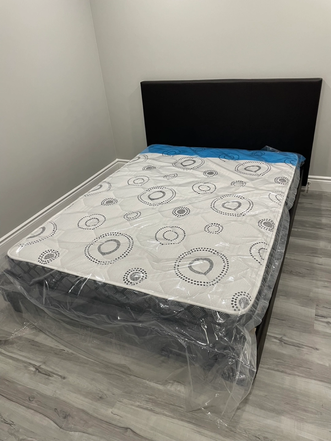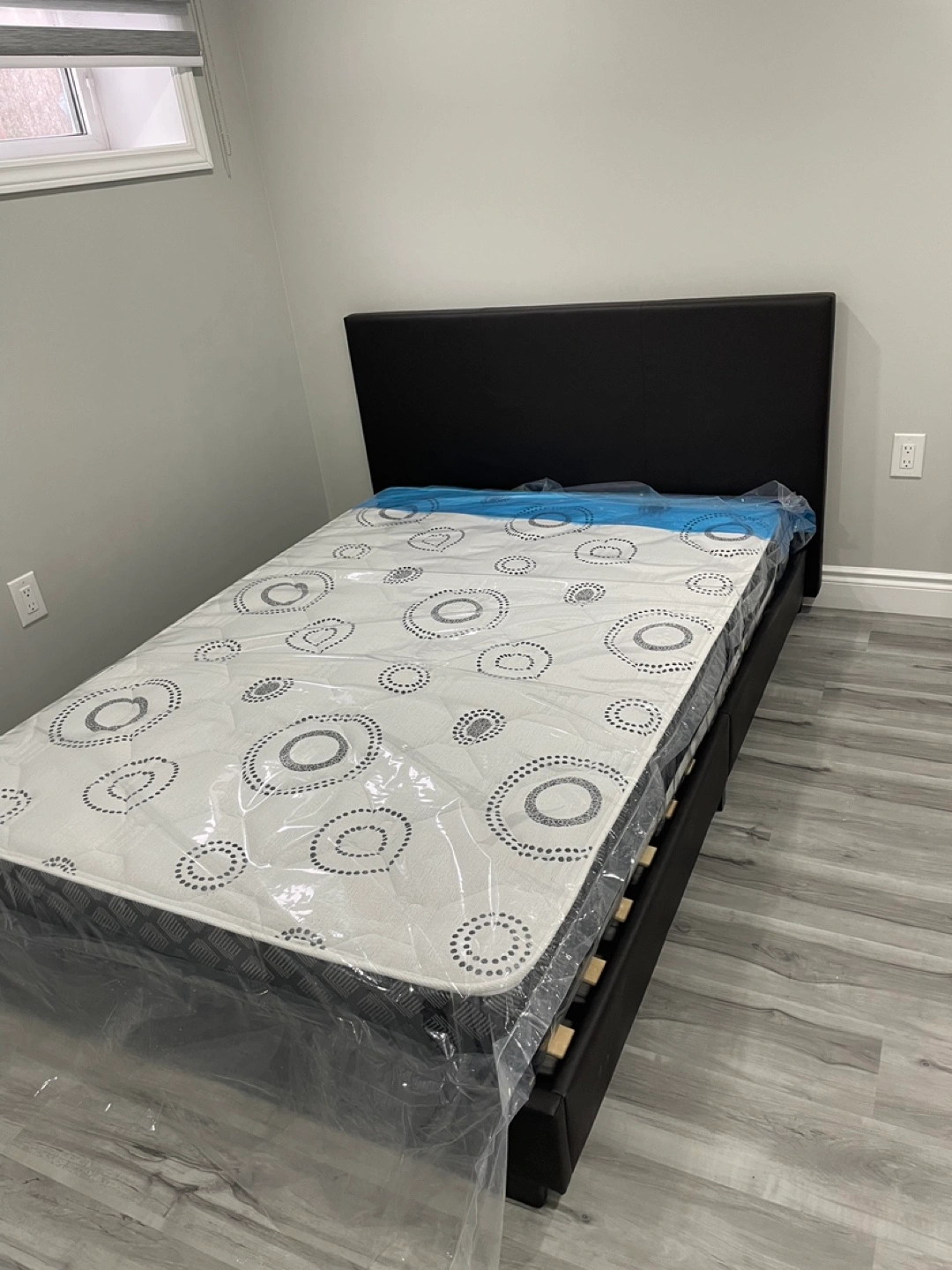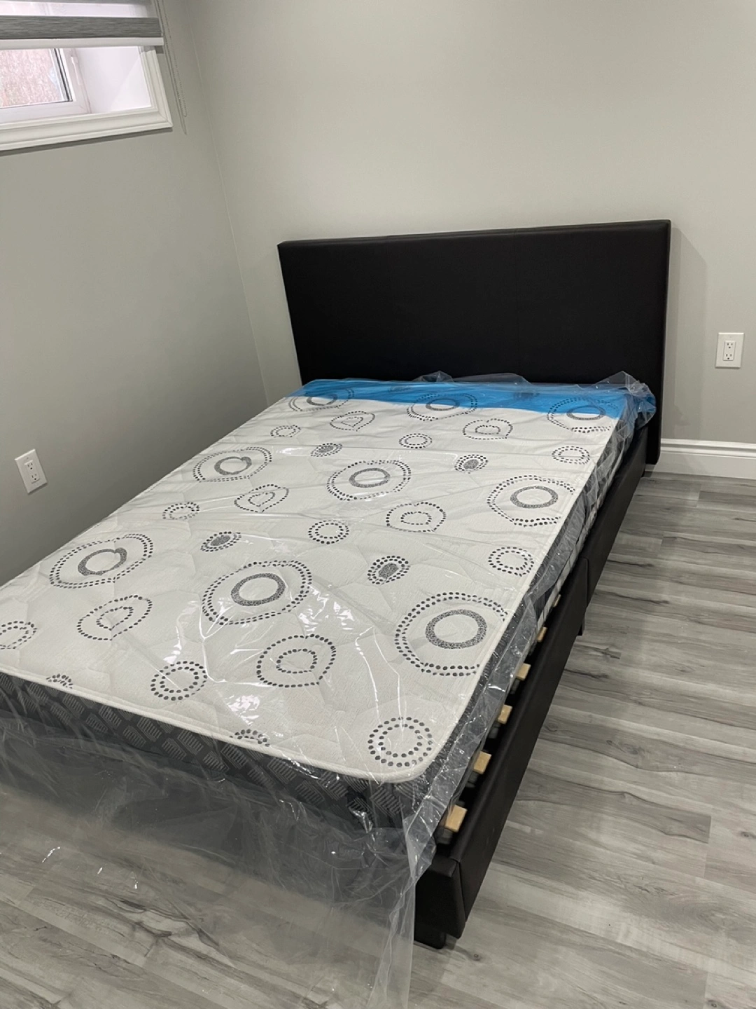Double bed frame with headboard and a double mattress included. The frame is upholstered in black fabric. Both the bed frame and mattress are in excellent condition.