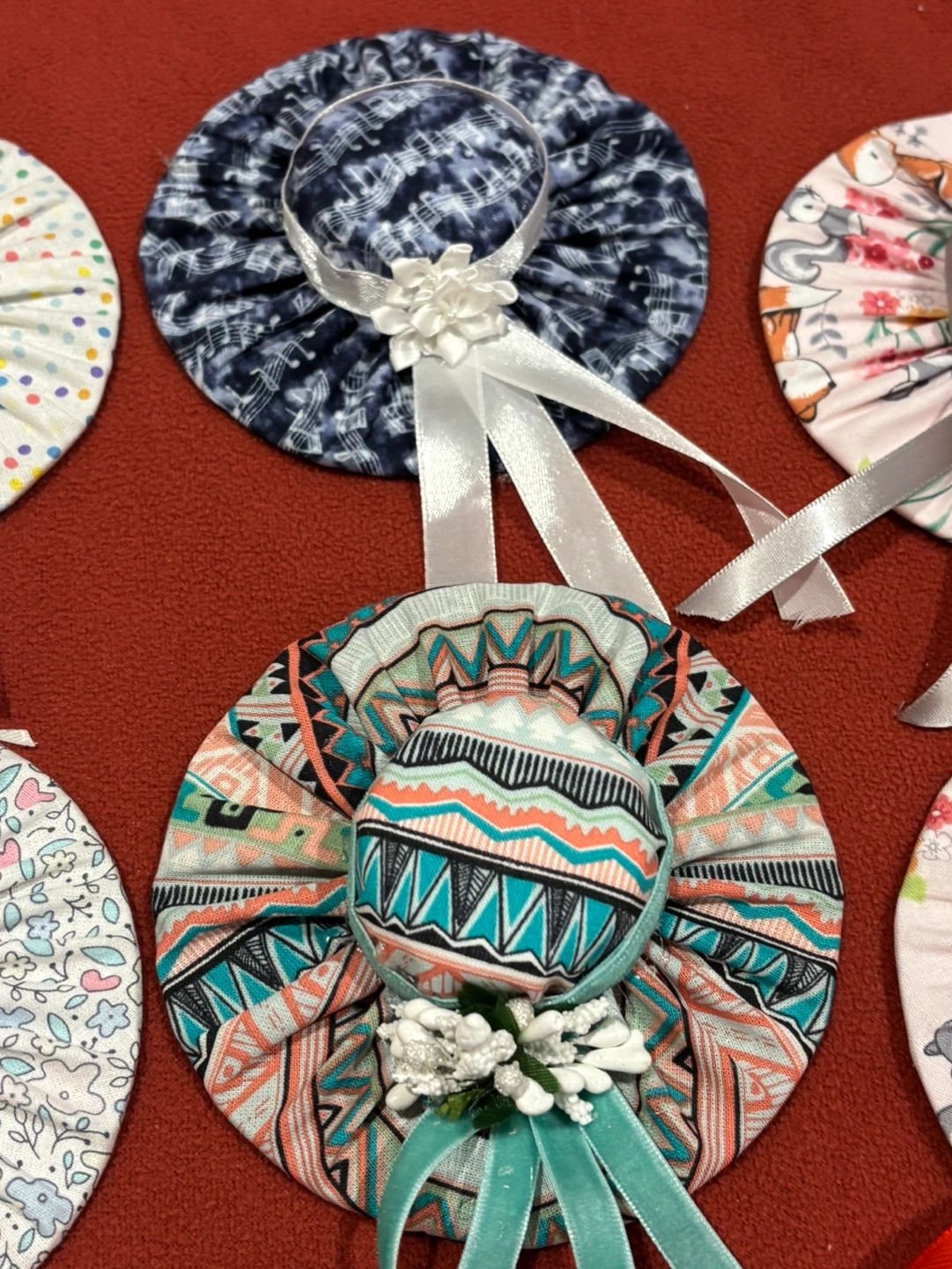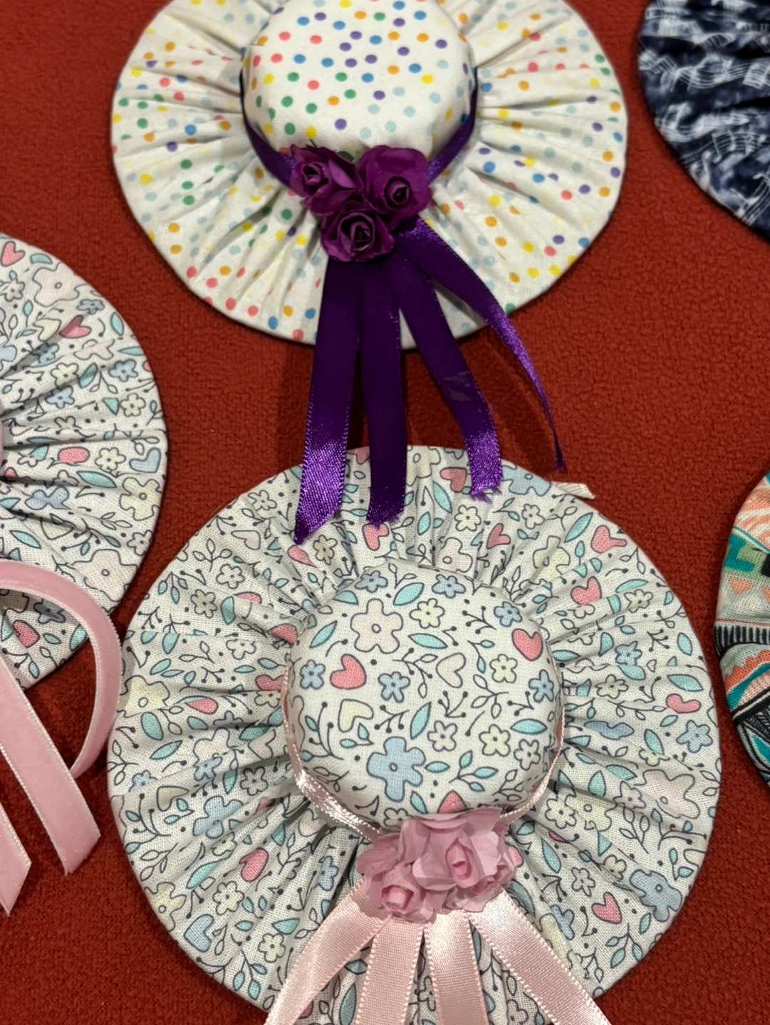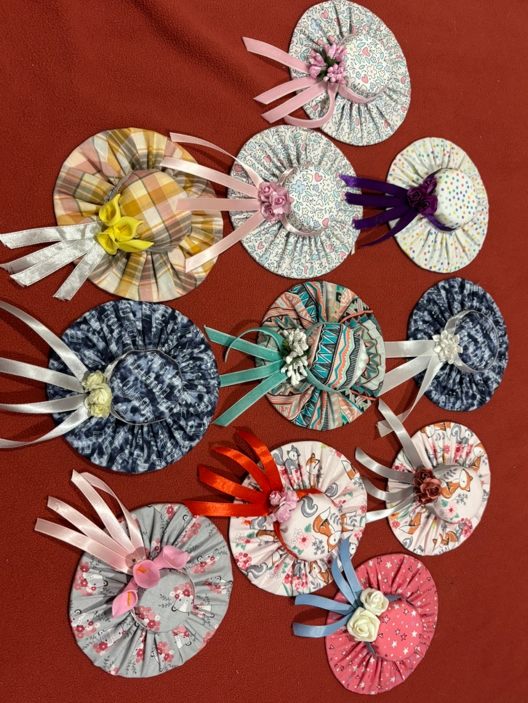 5$ each or 2 for 8$! handmade fabric hats. Perfect for decorating a home or adding a unique touch to a gift.