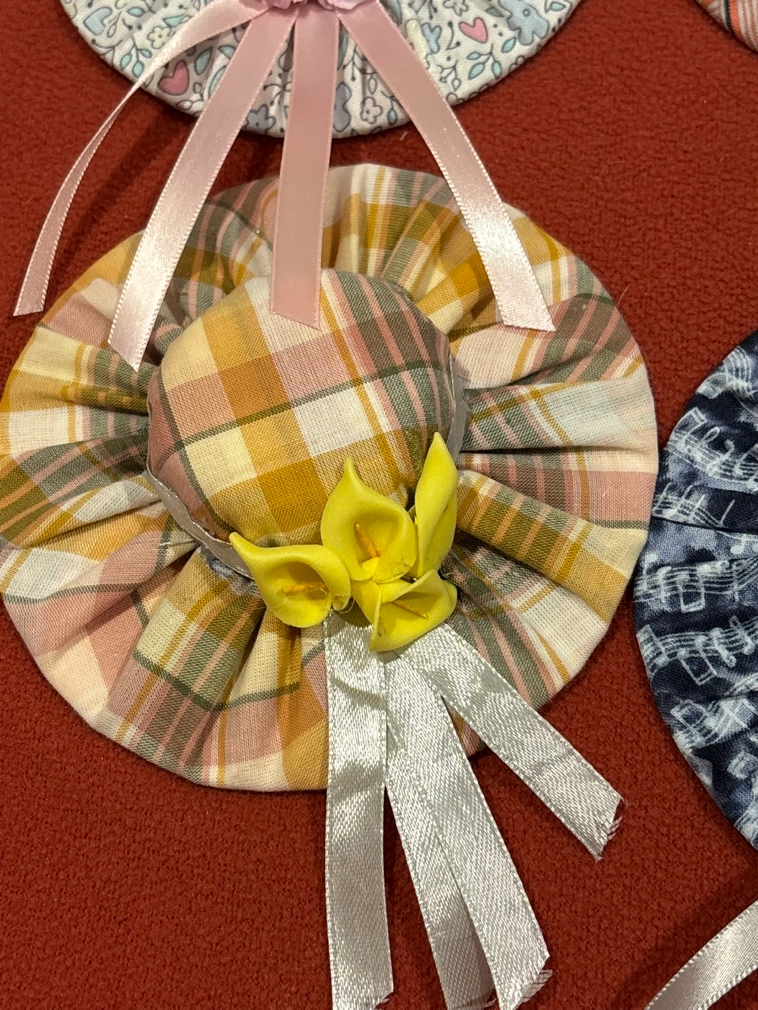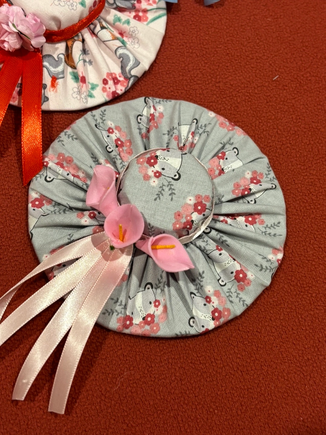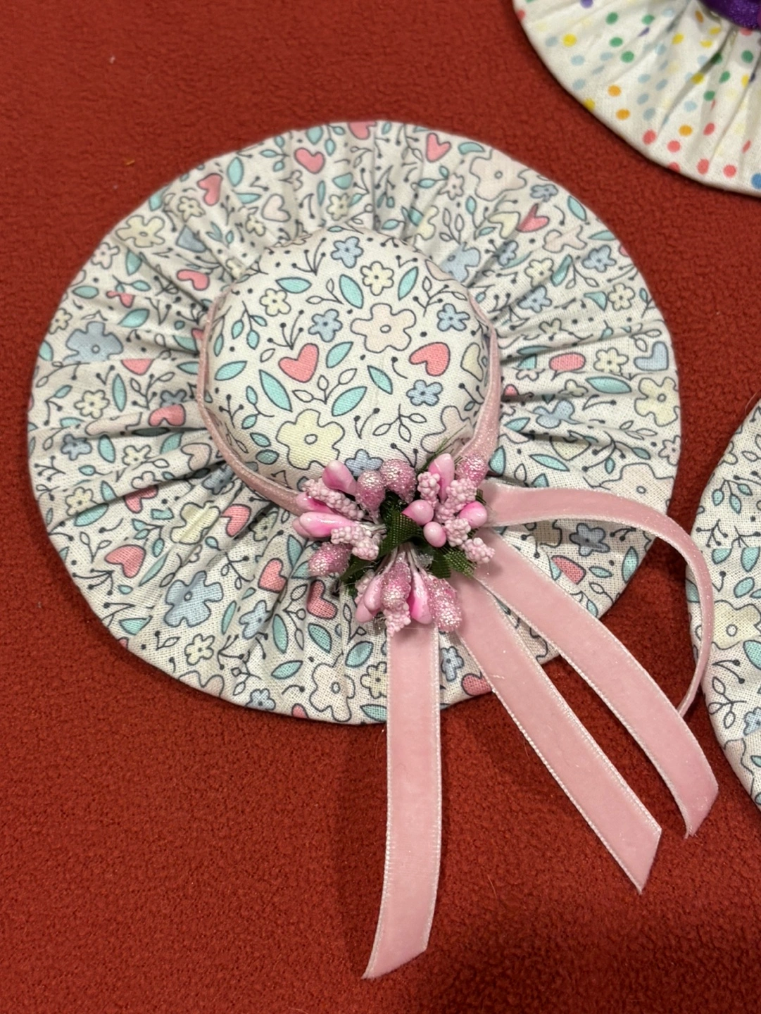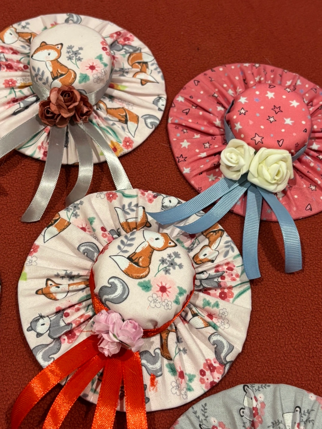 5$ each or 2 for 8$! handmade fabric hats. Perfect for decorating a home or adding a unique touch to a gift.