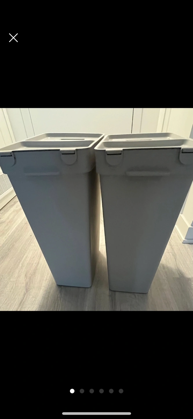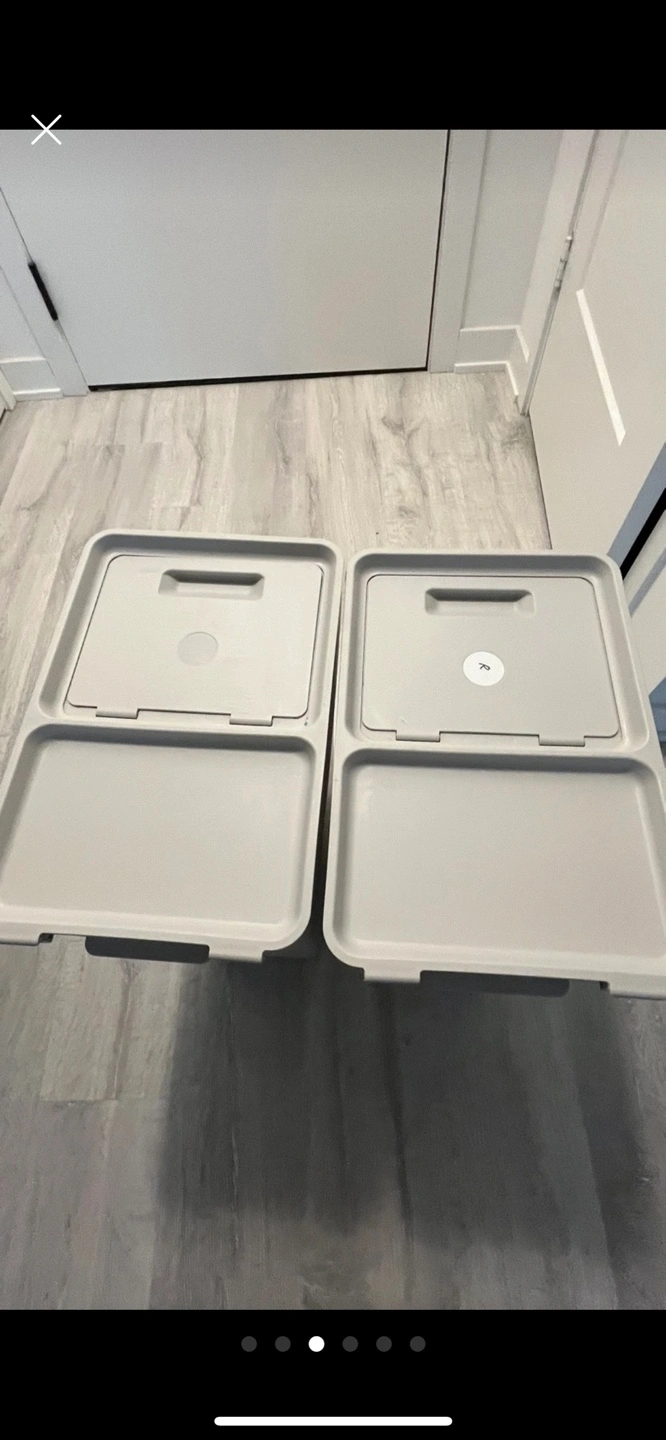 IKEA Trash/storage/recycling bins with lids, light gray, 35 l (9 gallon). I have 2 of them. The price is a set of 2. Never used. Clean and like new