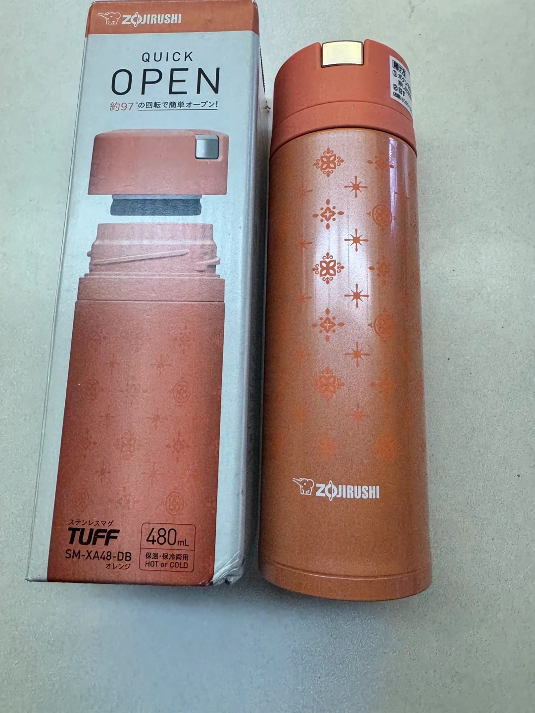 Orange Zojirushi Tuff 480mL stainless steel tumbler with quick open lid.
