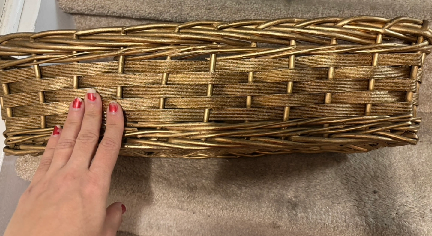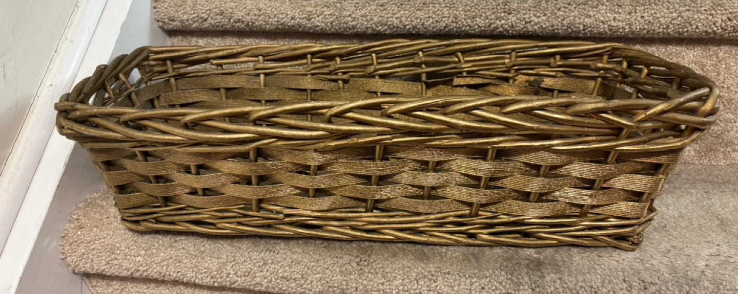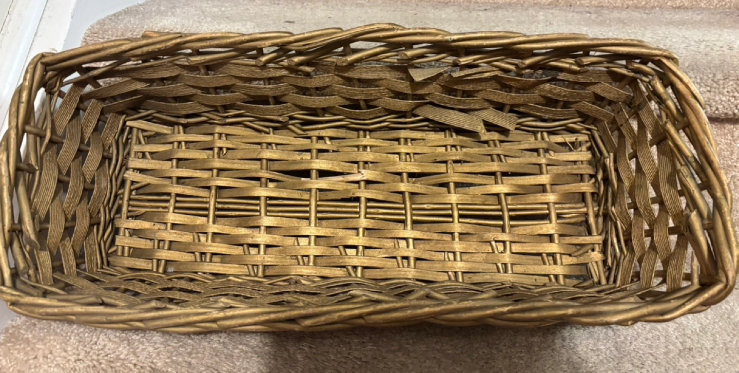 Gold wicker basket. Great for storage or display or gift Size 20”x9”x5” Pickup in Mississauga
