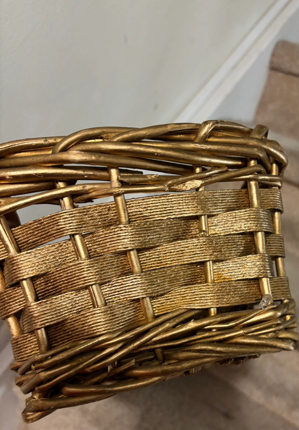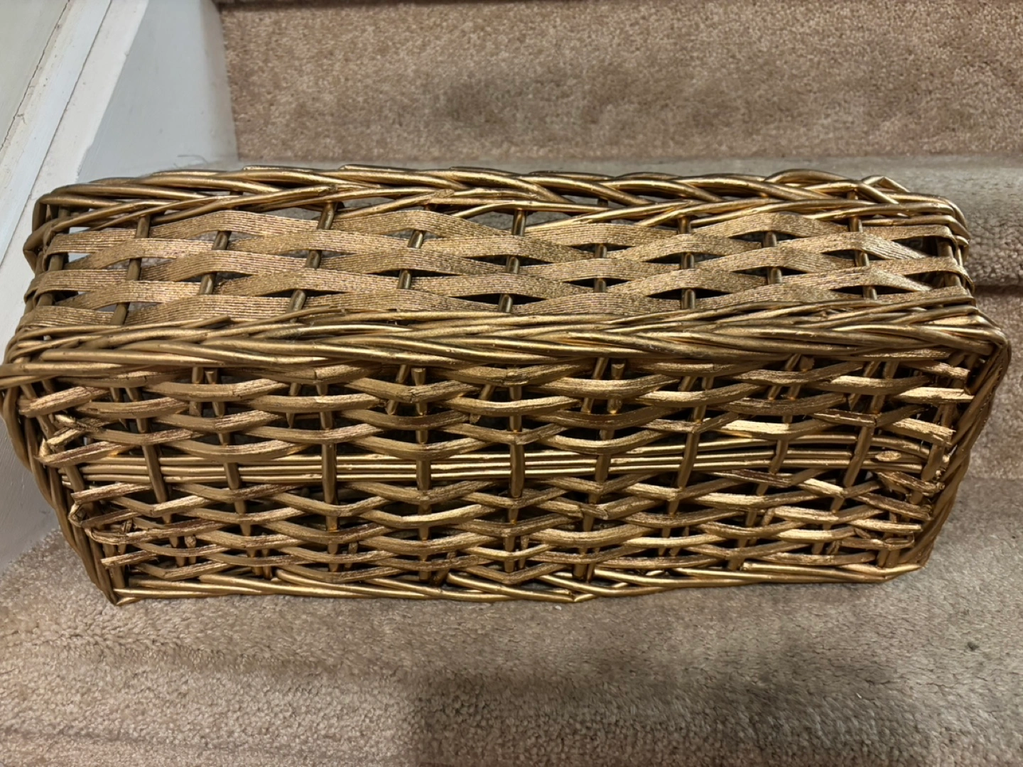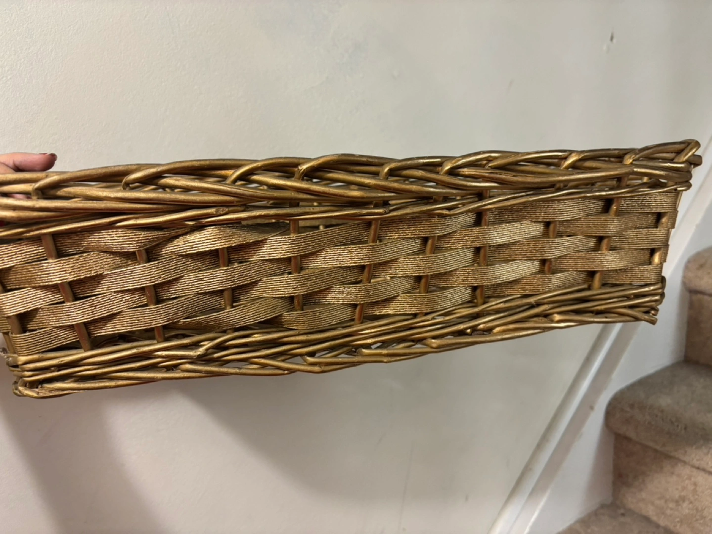 Gold wicker basket. Great for storage or display or gift Size 20”x9”x5” Pickup in Mississauga