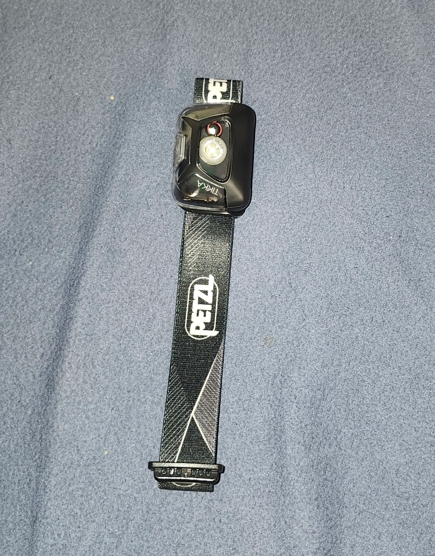 Headlamp with adjustable strap. Black and grey and battery is included.