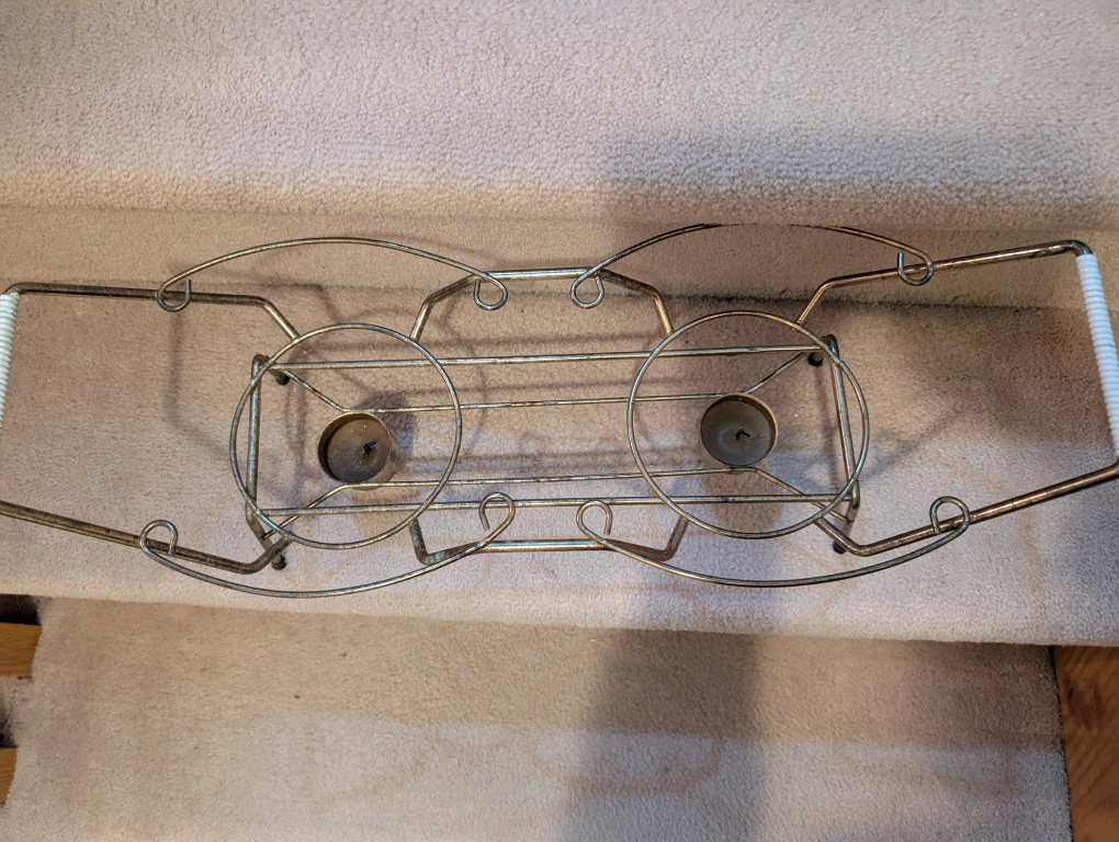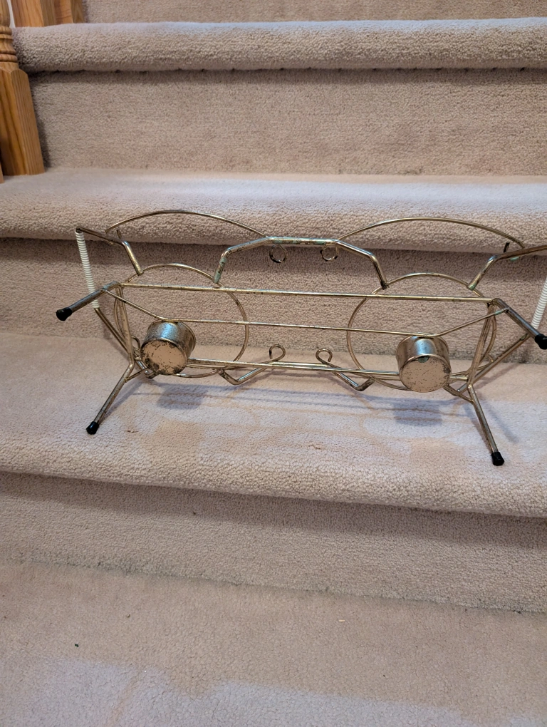 Metal serving stand with two tiers. Has two small candle holders on the bottom tier. Features two handles on each side. Shows signs of wear.