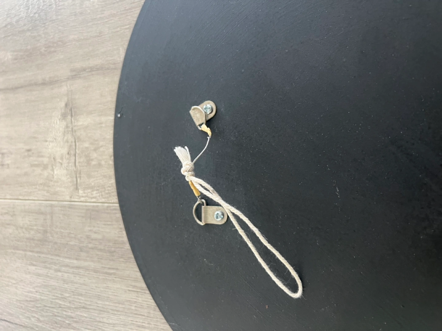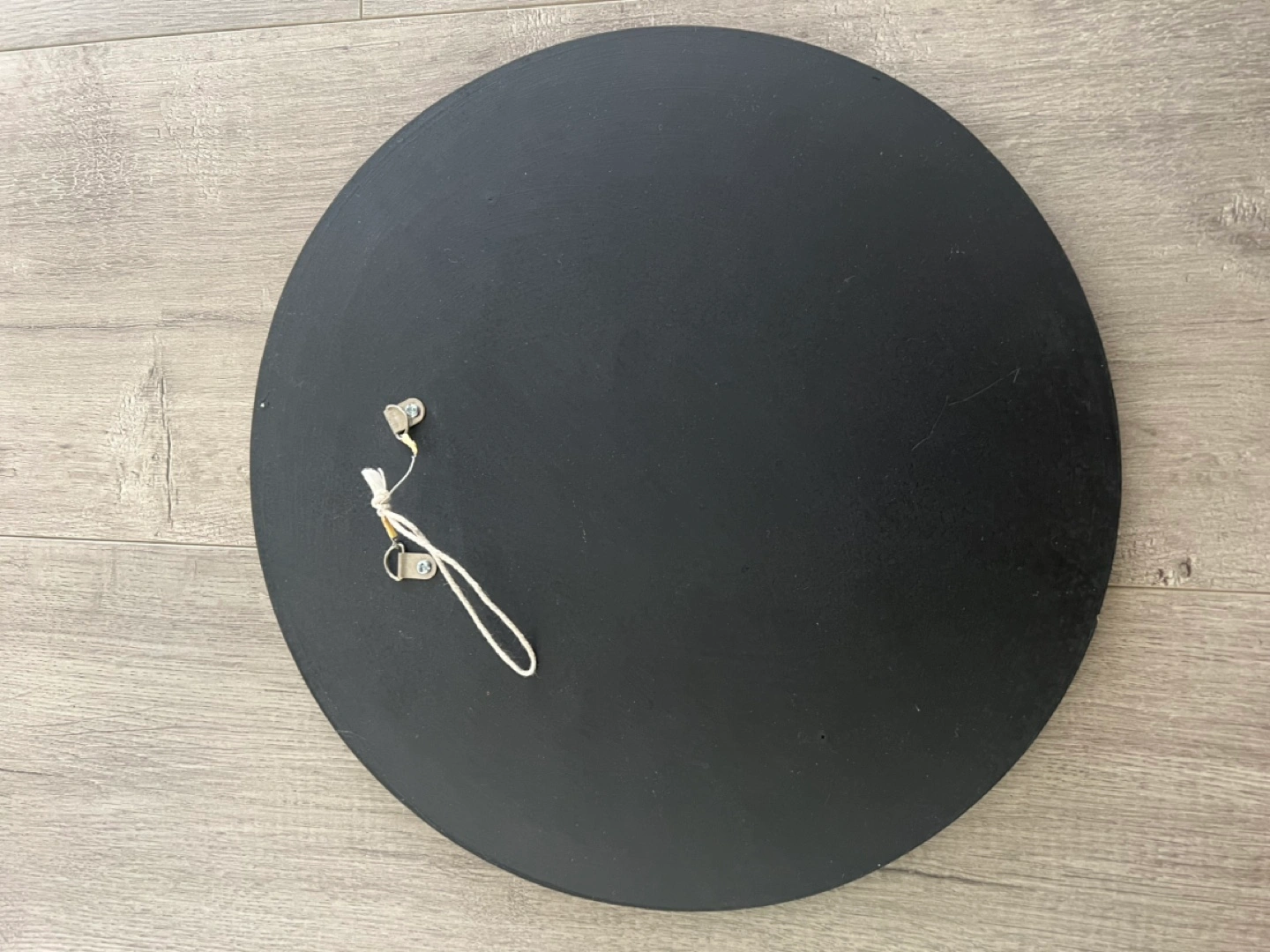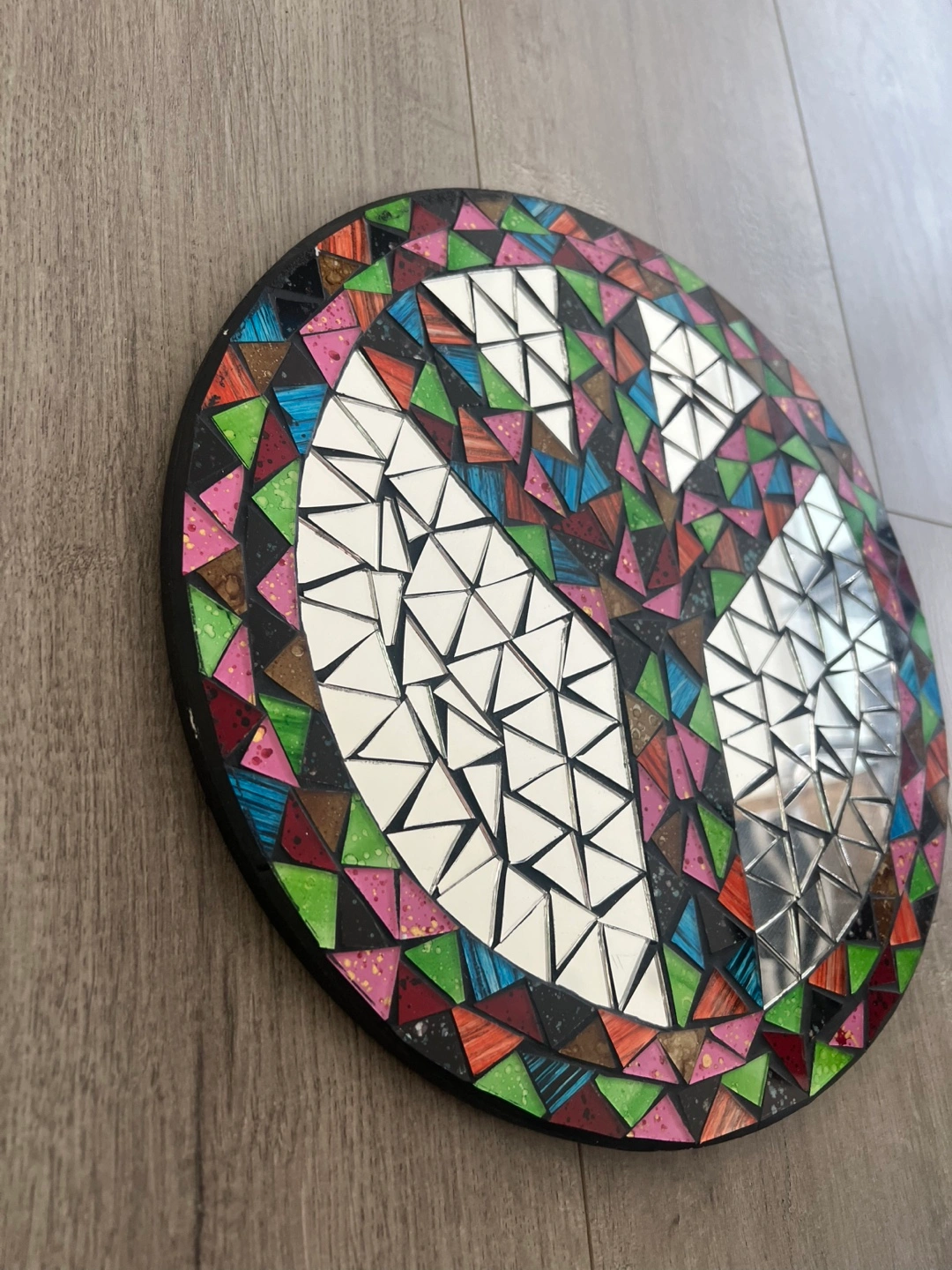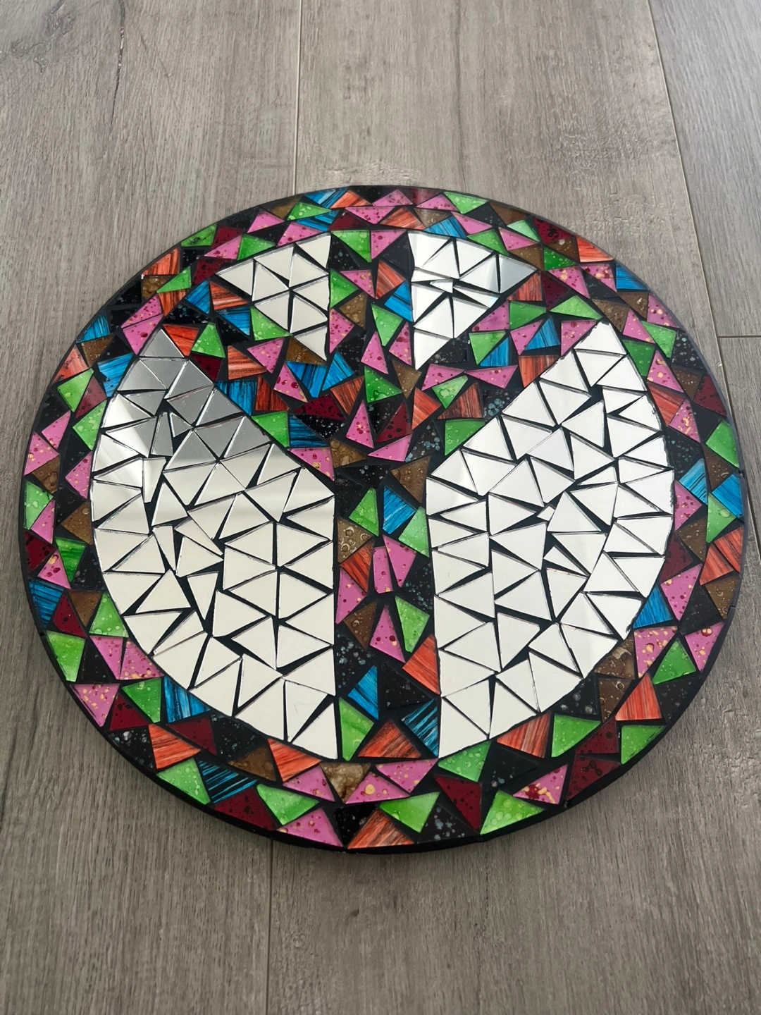 Round mirror in the shape of a peace sign. Made of small, colourful, mirrored tiles.