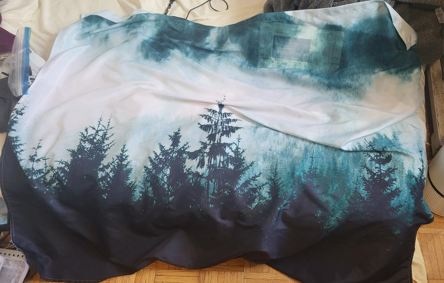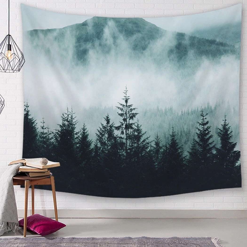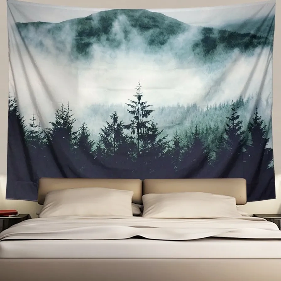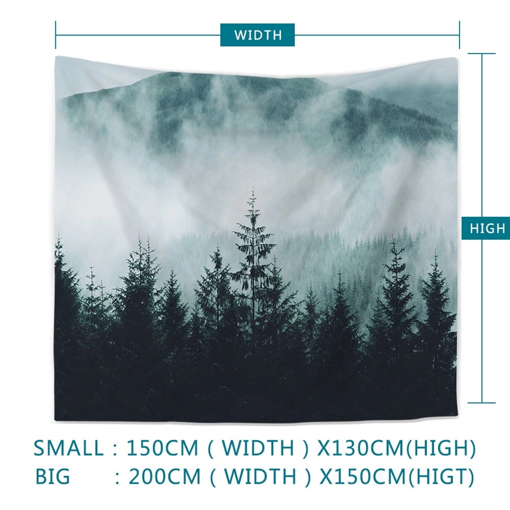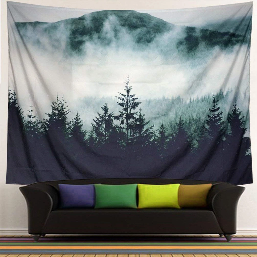 Tapestry featuring a forest scene with mountains and fog in the background. Great for adding a touch of nature to your home decor. W: 150*130cm(59.06*51.18in) Located in downtown Toronto ( Yonge/Sherbourne and Bloor and Sherbourne and Wellesley) Cash or etransfer is fine.